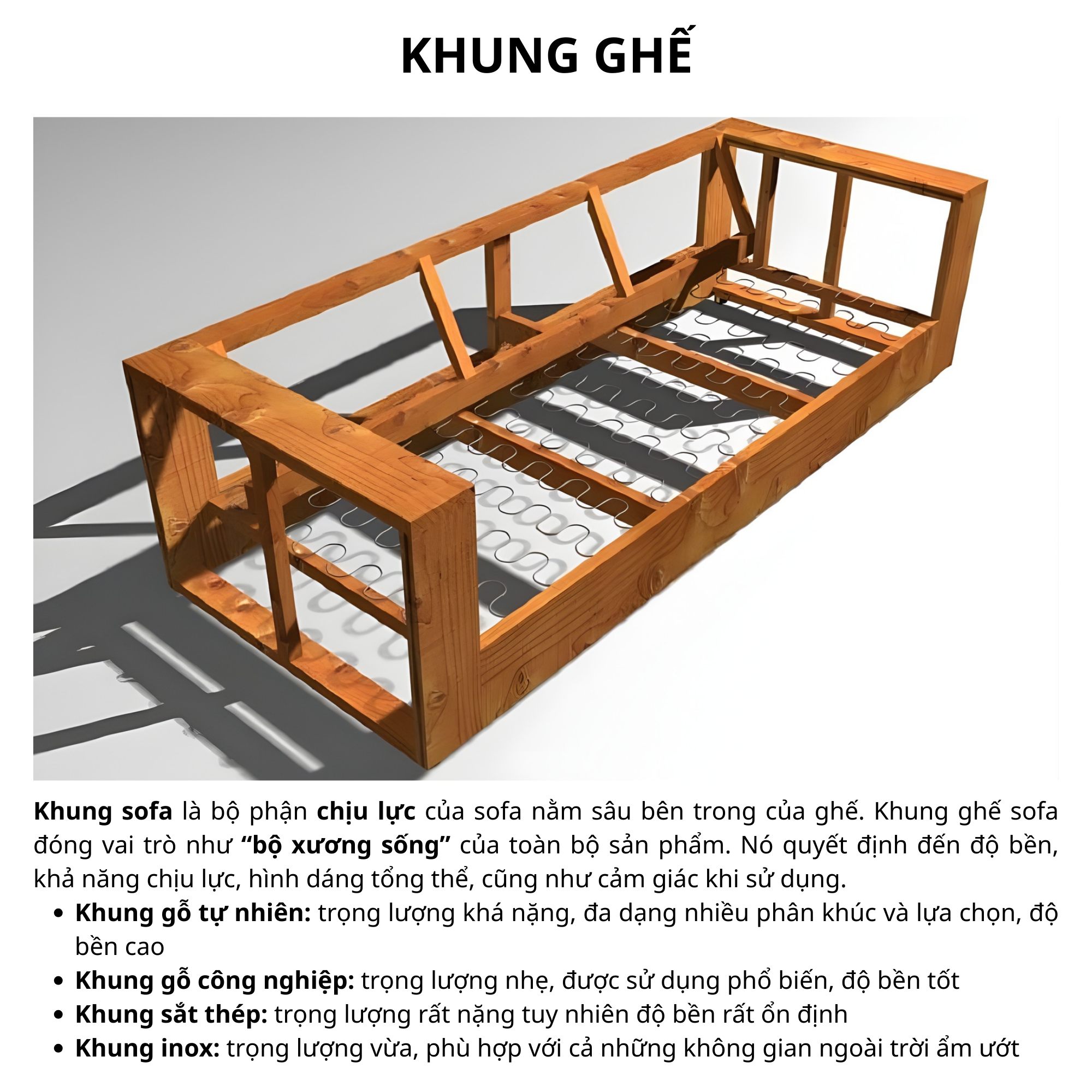 Khung sofa là bộ phận chịu lực quan trọng nhất, nằm sâu bên trong ghế. Như một bộ xương sống, khung ghế quyết định trực tiếp đến hình dáng tổng thể, khả năng chịu tải và độ vững chãi khi sử dụng.