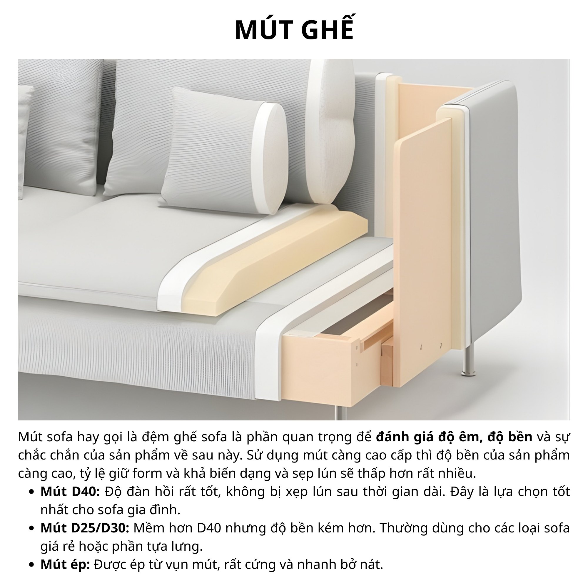 - Mút D40: Đây là "vua" của các loại mút sofa gia đình. Với độ đàn hồi vượt trội và khả năng giữ form cực tốt, D40 không bị xẹp lún dù sử dụng trong thời gian dài.