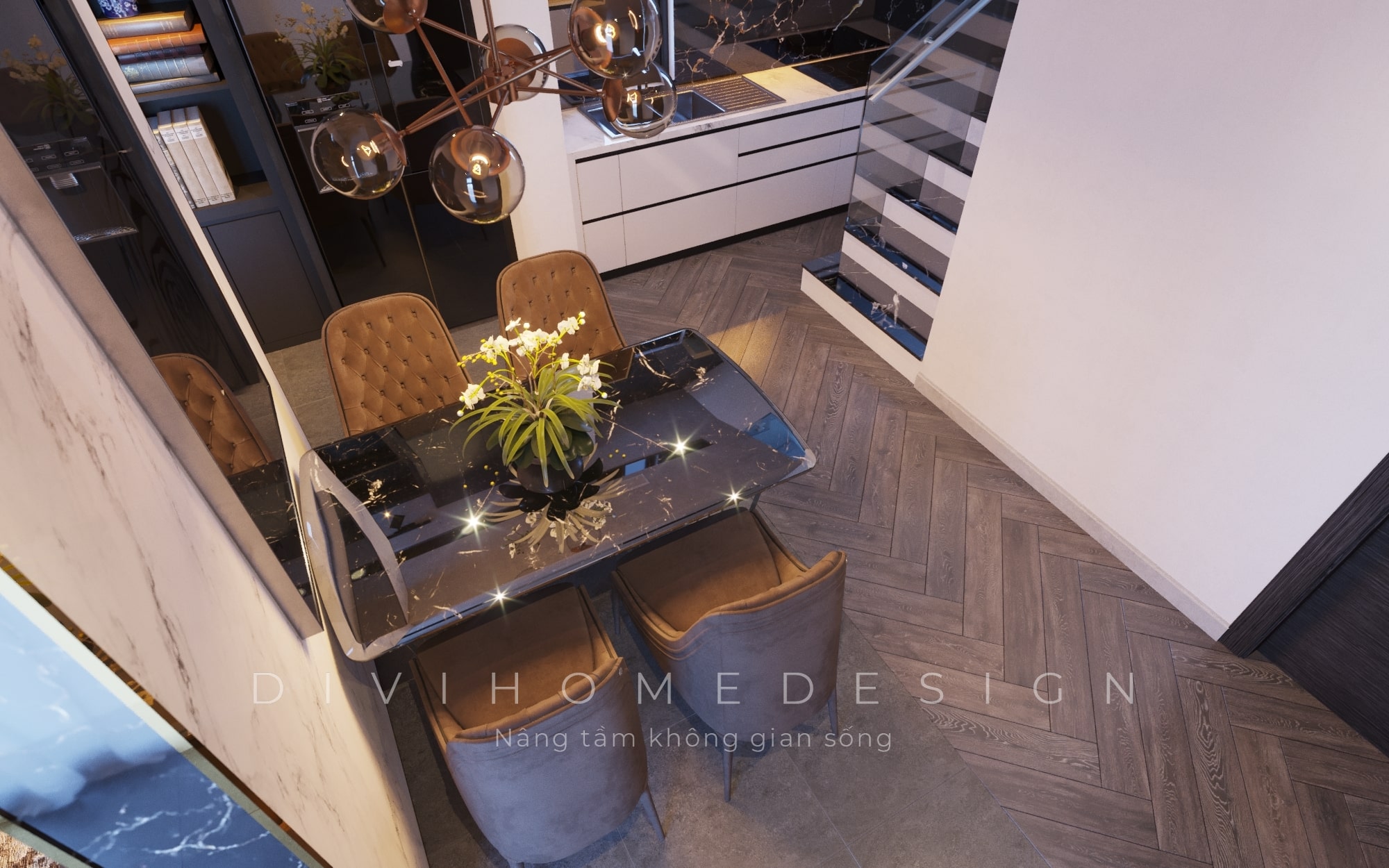 Không gian khách - bếp được đặt tại tầng 1 của ngôi nhà. Tông màu nâm trầm được dùng làm chủ đạo. Nổi bật lên đồ nội thất với vật liệu cao cấp, đặc biệt là chất liệu đá tự nhiên với hiệu ứng bóng gương tạo nên vẻ đẹp sang trọng. Phòng khách được bày trí rộng rãi và thông thoáng. Căn bếp không quá rộng nhưng vẫn đảm bảo công năng khi cần thiết.