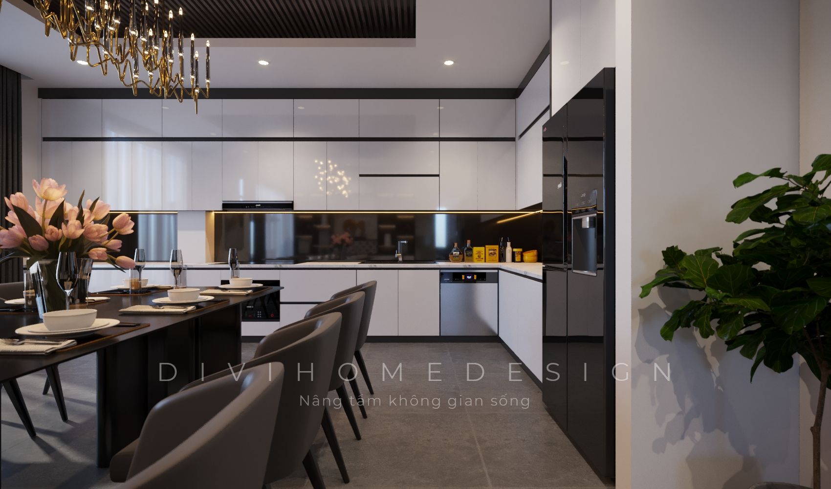 Bộ bàn ăn tông màu đen da bóng nổi bật giữa phòng bếp