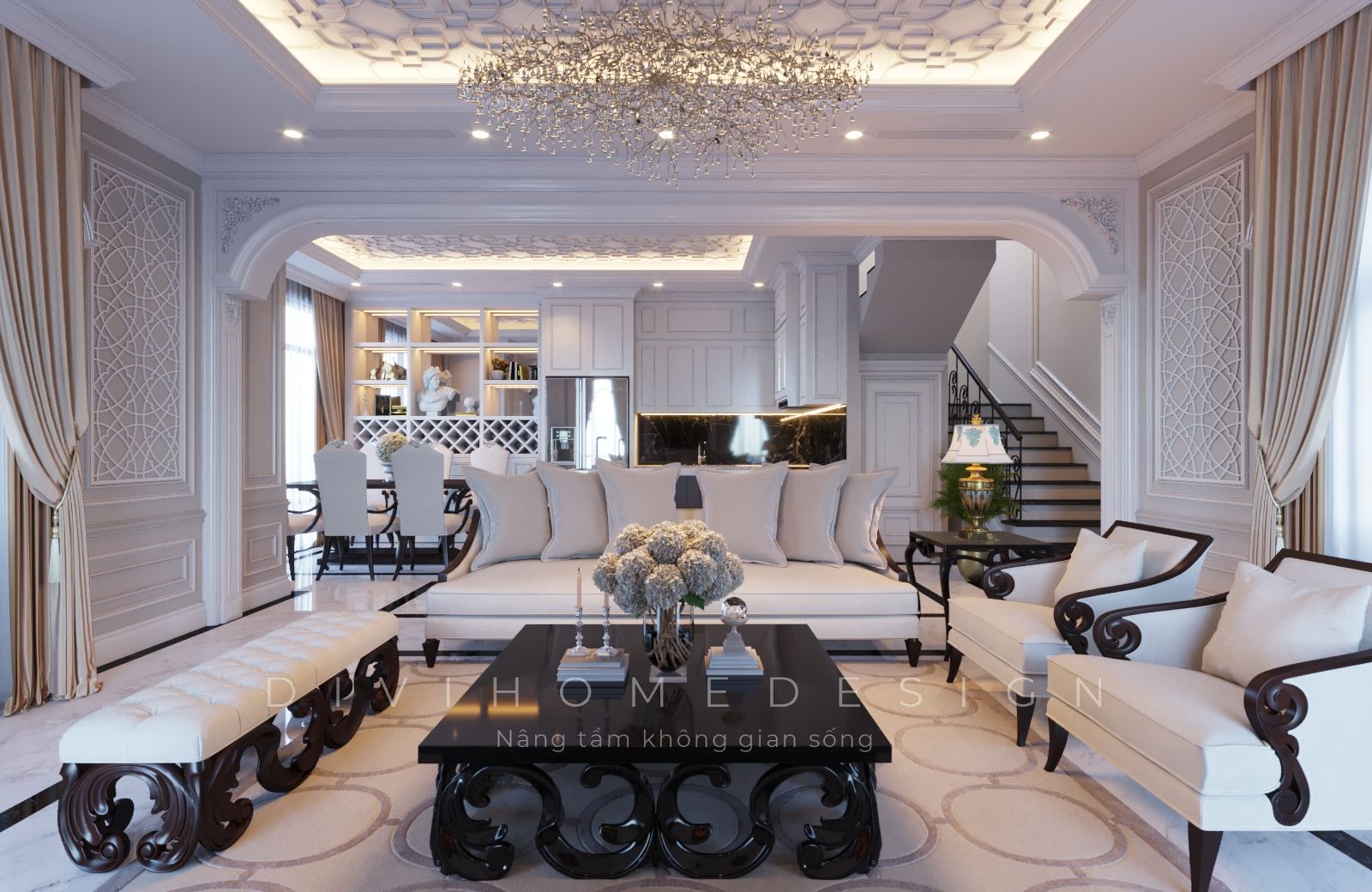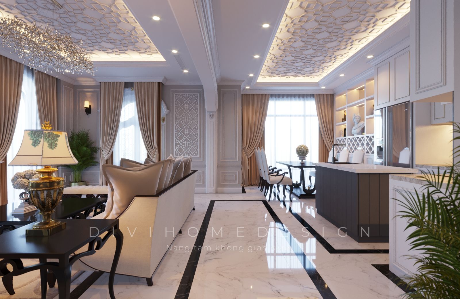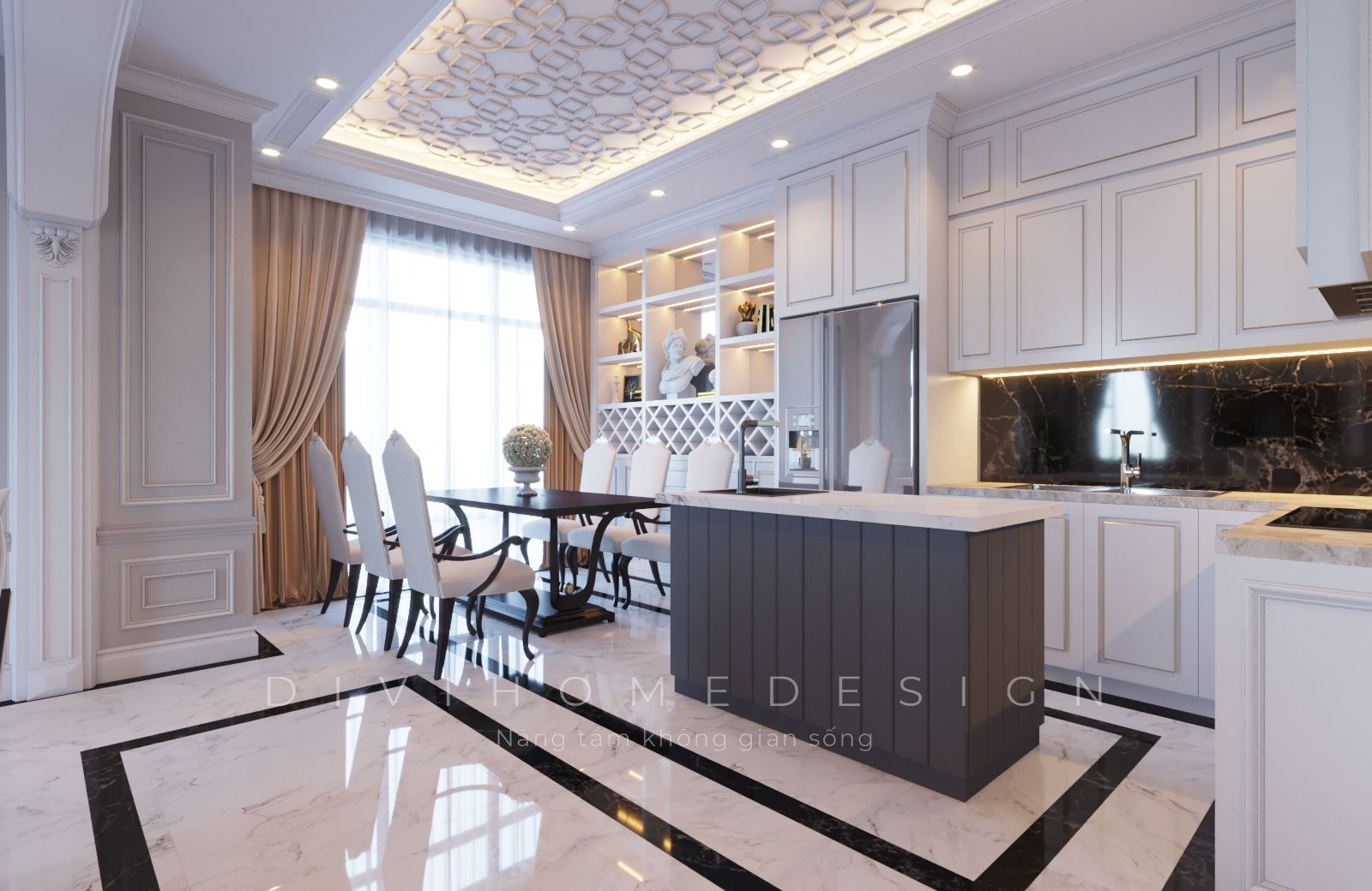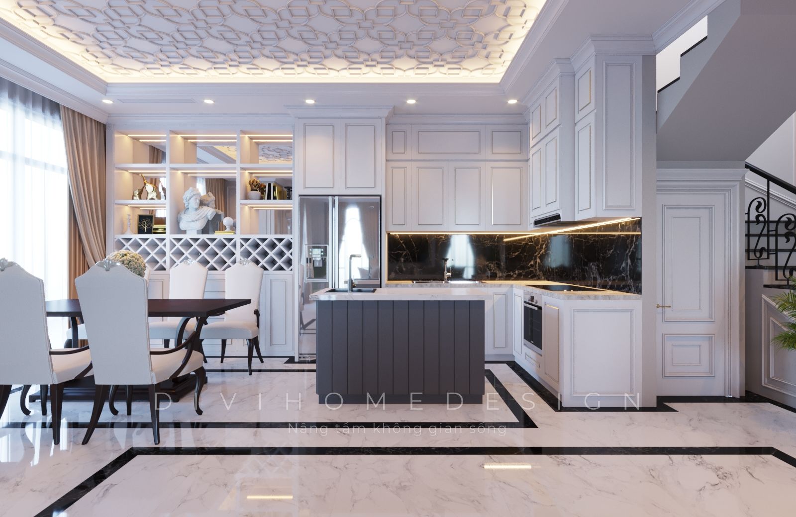 Phòng khách,phòng bếp và bàn ăn được phân chia theo không gian mở. Theo đó 3 khu vực được thông liền với nhau tạo thành không gian sinh hoạt chung. Đây vừa là nơi tiếp khách vừa là nơi sum họp của gia đình. Trên nền trắng chủ đạo, các yếu tố trang trí như phào chỉ, đèn thả trần hay bộ bàn ghế chạm khắc giúp không gian thêm thú vị và sinh động.