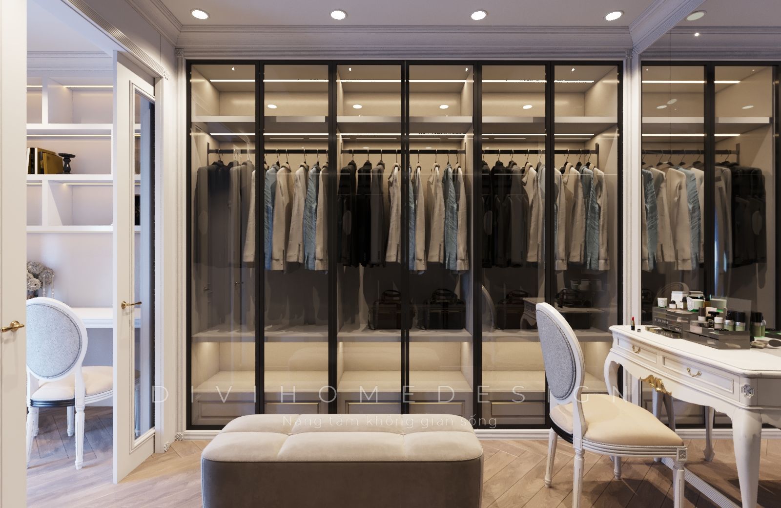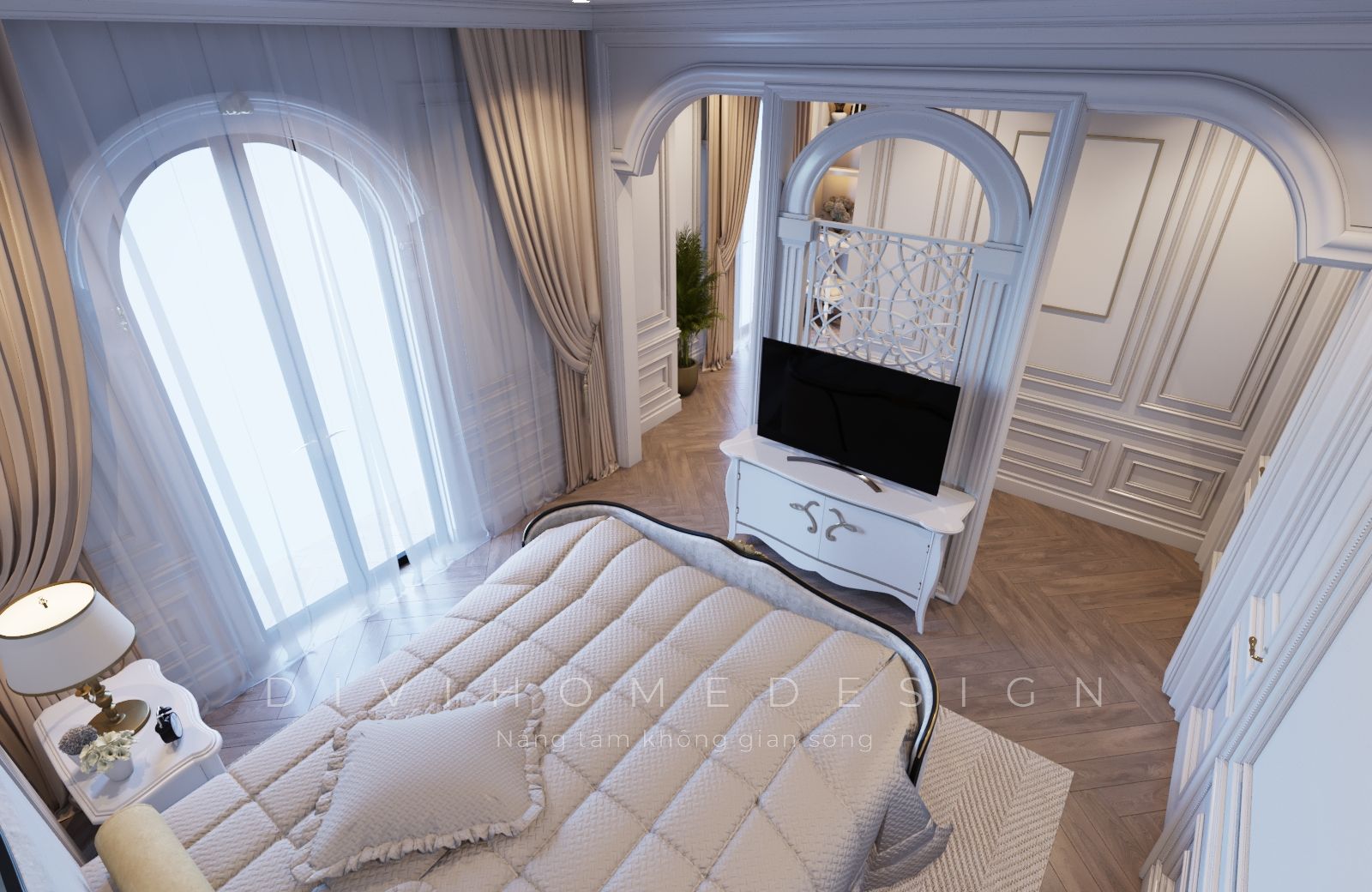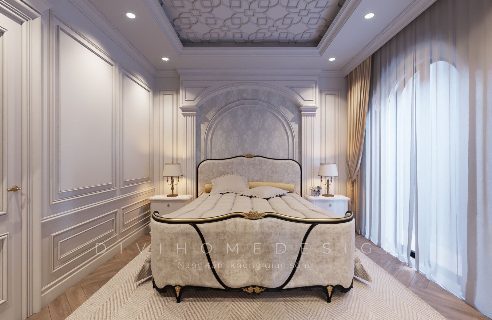 Nội thất phòng ngủ như tái hiện không gian nghỉ ngơi của quý tộc xưa. Tông màu trắng xám nền nã kết hợp ánh sáng đèn vàng dịu dàng. Chiếc giường lớn bọc nhung êm ái có họa tiết trang trí đẹp mắt. Các đồ dùng nội thất khách được bố trí đối xứng quanh tâm giường ngủ vô cùng gọn gàng. Yếu tố công năng và thẩm mỹ được cân bằng hài hòa tạo nên một phòng nghỉ vô cùng thoải mái và thư giãn dành cho gia chủ.
