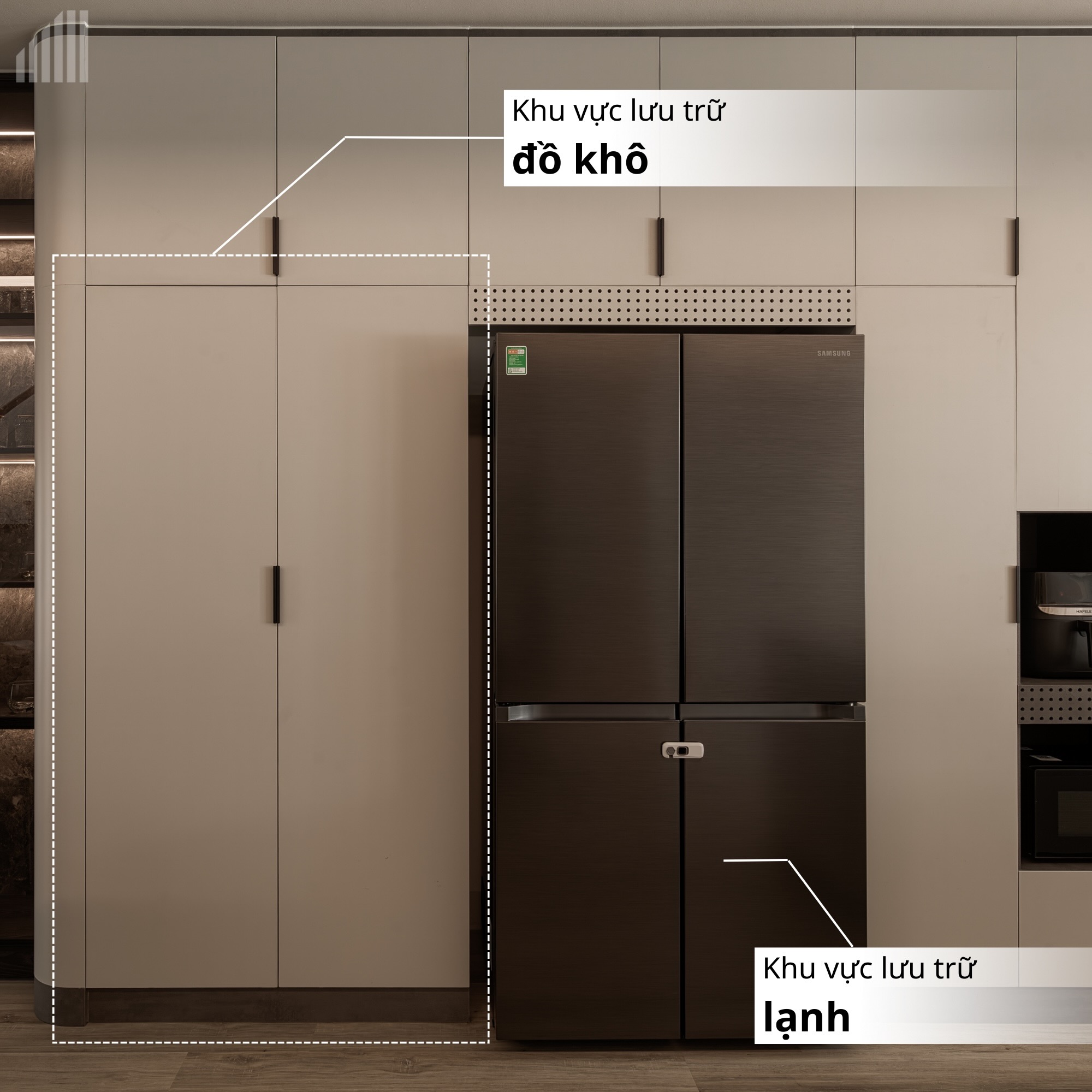 Khu vực này là nơi bắt đầu của chu trình nấu nướng, nơi gia chủ lưu trữ các thực phẩm không cần bảo quản lạnh như gạo, mì tôm, đồ hộp, gia vị và các loại hạt.