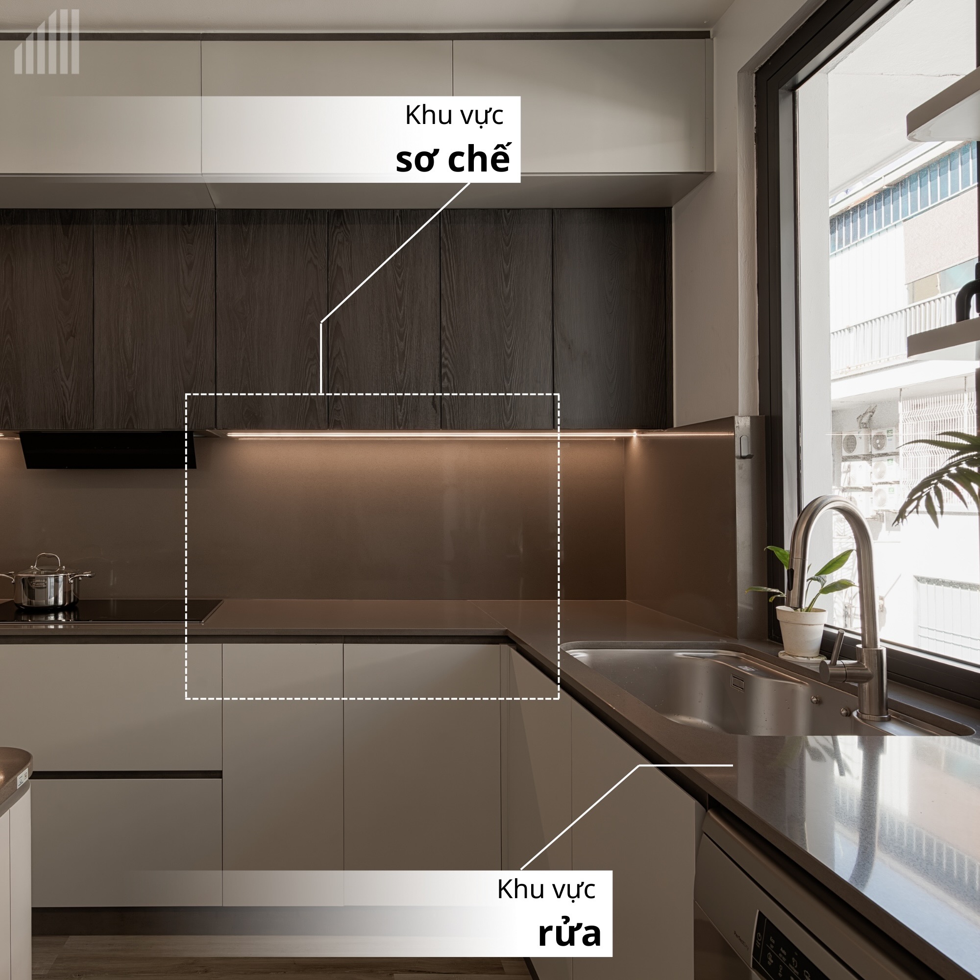 Khu rửa đóng vai trò kết nối giữa việc lưu trữ thực phẩm và sơ chế. Theo khảo sát, đây là nơi tiêu tốn nhiều thời gian nhất của người nội trợ (chiếm khoảng 60% thời gian đứng bếp). Vì vậy, khu vực này cần hết sức chú ý và thiết kế tối ưu để tiết kiệm thời gian cho gia chủ.