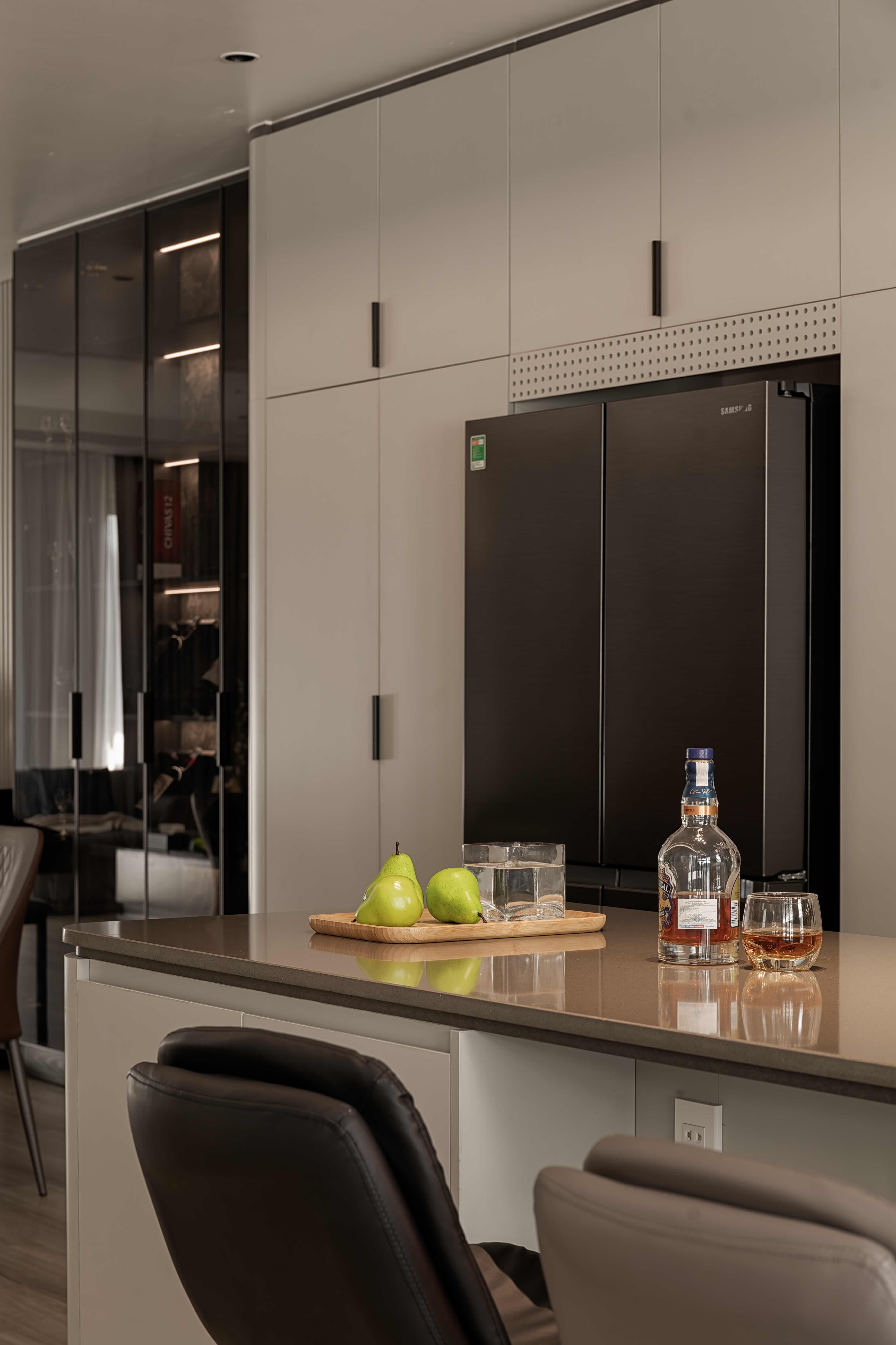 Đảo bếp không chỉ là một điểm nhấn thẩm mỹ sang trọng mà còn là khu vực đa năng nâng tầm tiện ích cho không gian sống. Trước hết, nó cung cấp thêm diện tích mặt bằng rộng rãi để sơ chế thực phẩm hoặc bày biện món ăn, giải quyết tình trạng chật chội trên hệ tủ chính. Ngoài ra, đảo bếp đóng vai trò như một không gian lưu trữ thông minh với các ngăn kéo, hộc tủ phía dưới để chứa đồ dùng nhà bếp ít khi sử dụng. Đặc biệt, đây còn là nơi kết nối các thành viên trong gia đình, vừa có thể làm bàn ăn nhanh vừa là góc làm việc hay nơi trẻ nhỏ ngồi trò chuyện cùng bố mẹ khi đang nấu nướng.