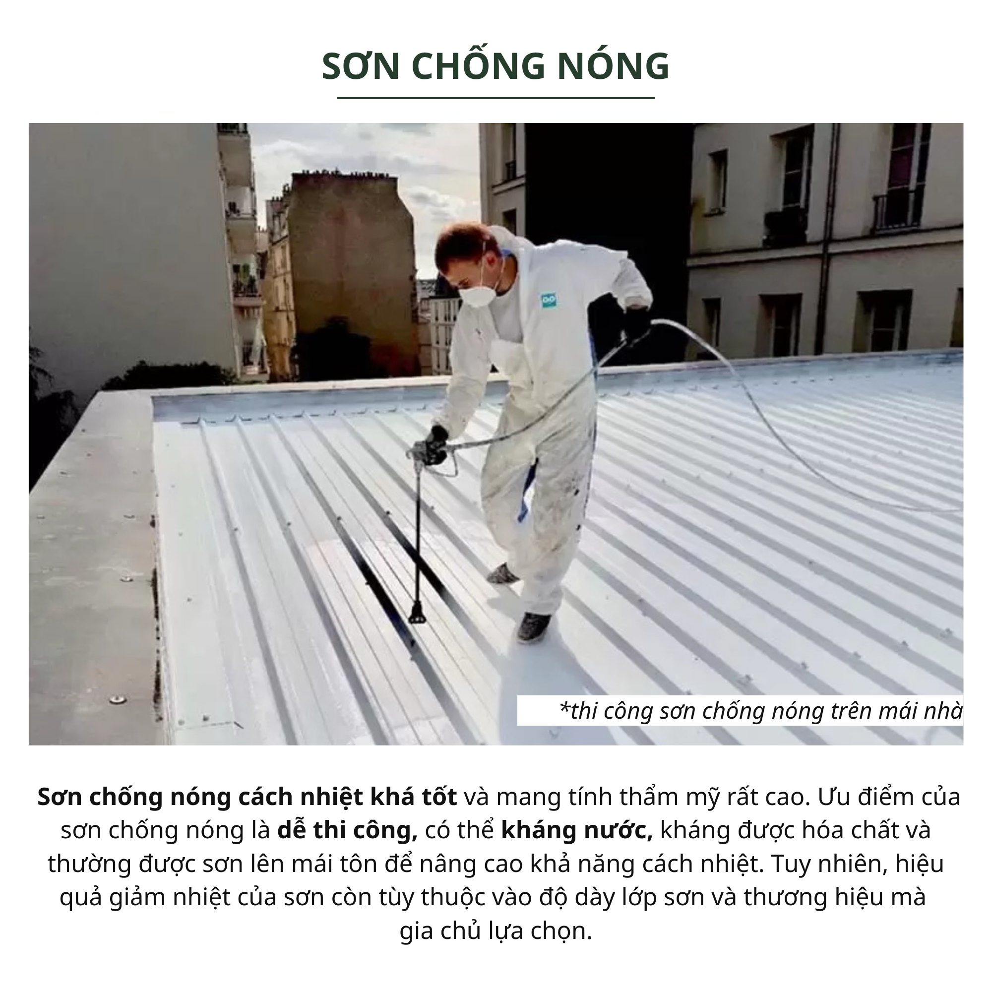 Sơn chống nóng (hay sơn cách nhiệt) là giải pháp hàng đầu nhờ tính tiện lợi và hiệu quả tức thì. Khác với sơn thông thường, loại sơn này chứa các phụ gia phản xạ ánh sáng mặt trời.