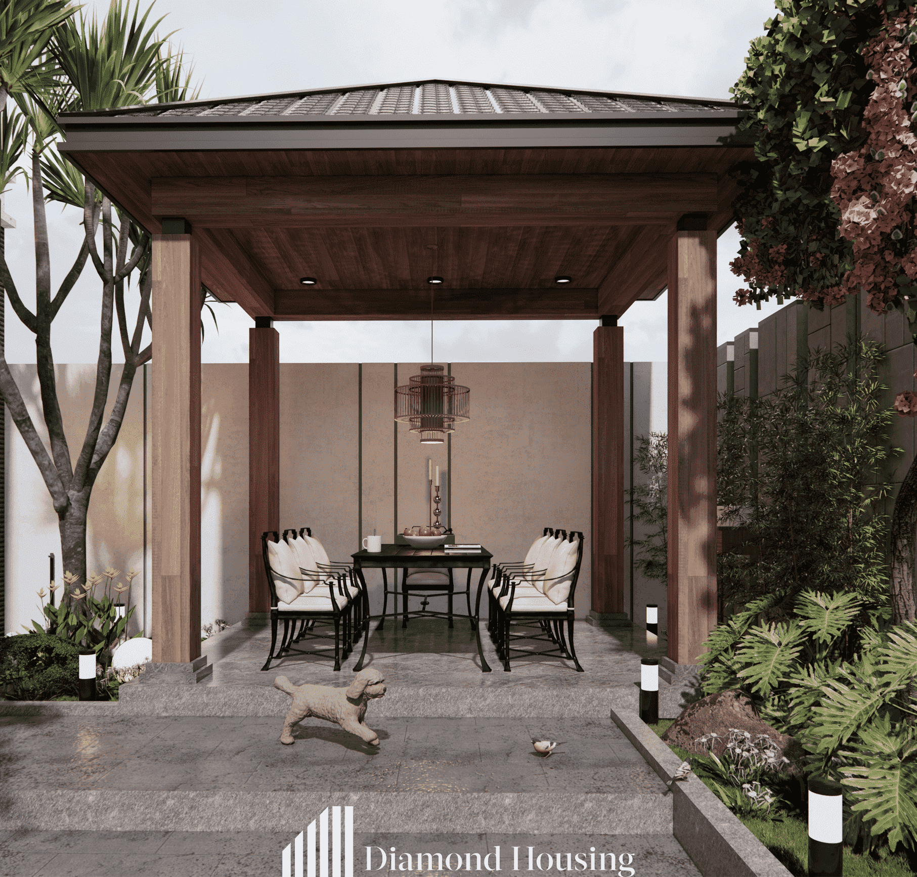 Khu vực chòi nghỉ ở ngay khuôn viên tầng 1 mang đậm nét kiến trúc Nhật Bản, cũng là điểm nhấn thiết kế độc đáo của công trình.