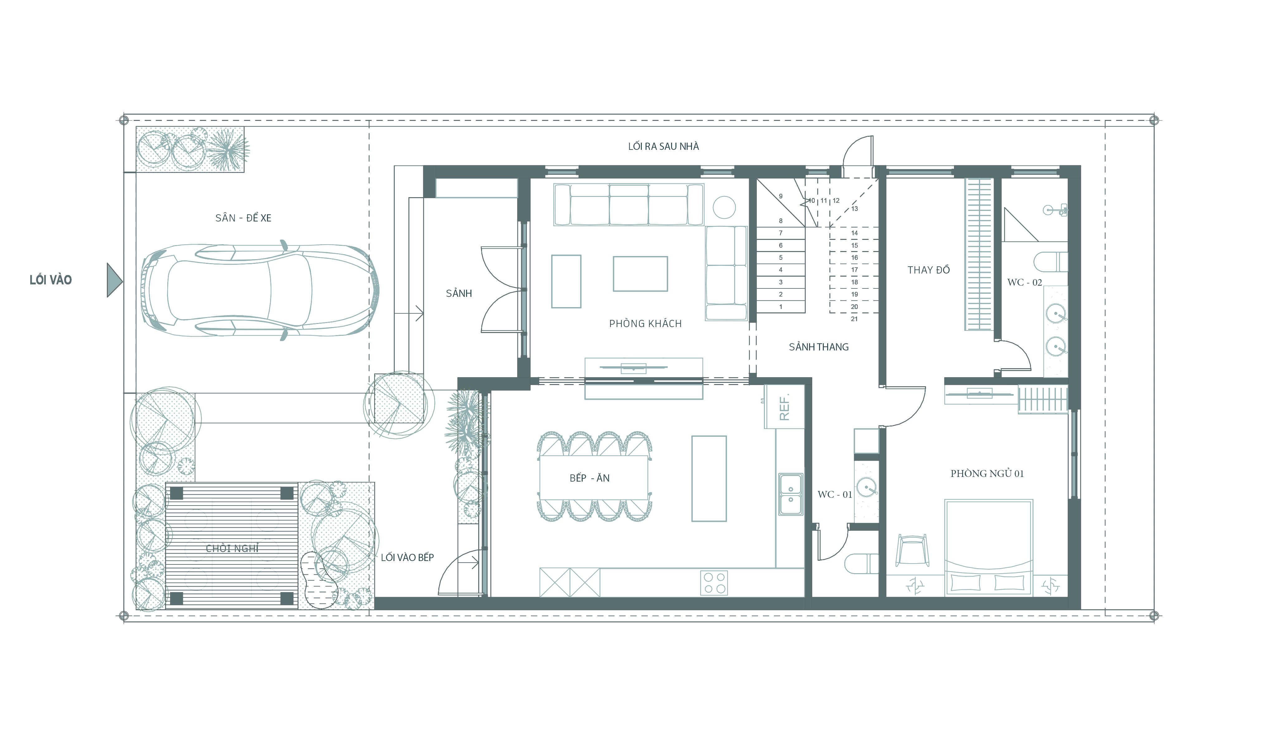 Tầng 1 được bố trí sảnh chính thông thoáng, phòng ngủ lớn và phòng khách. Điểm nhấn đặc biệt là khu vực chòi nghỉ mang đậm phong cách Nhật.