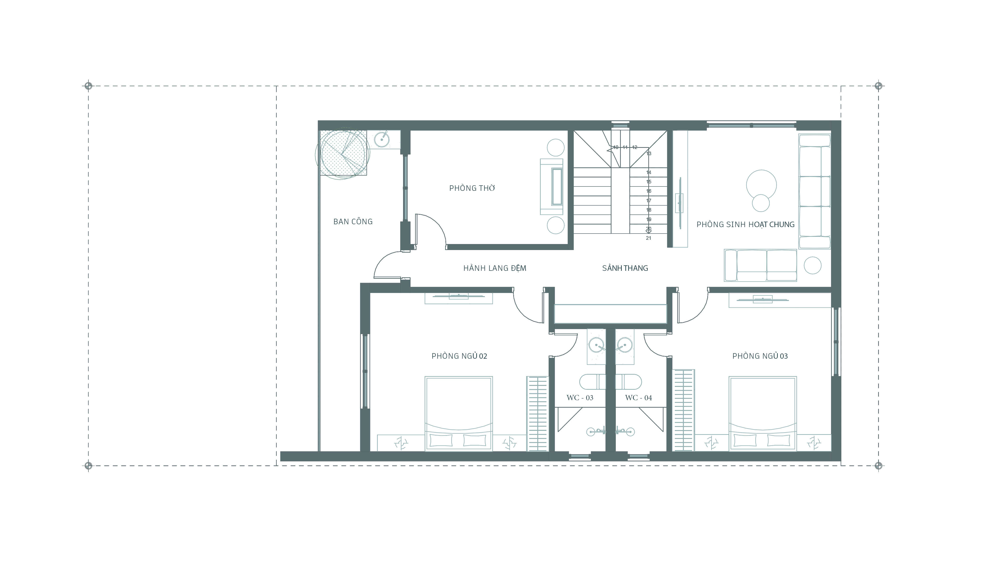 Tầng 2 được bố trí 2 phòng ngủ cùng sảnh thang thông tầng - tạo sự lưu thông và thông thoáng cho toàn bộ căn nhà. Công trình cũng được lồng ghép khoảng không gian ban công linh động đón sáng tự nhiên hiệu quả.