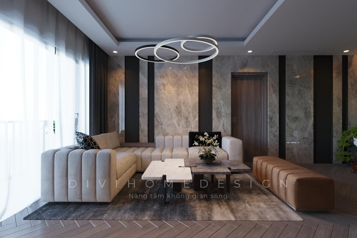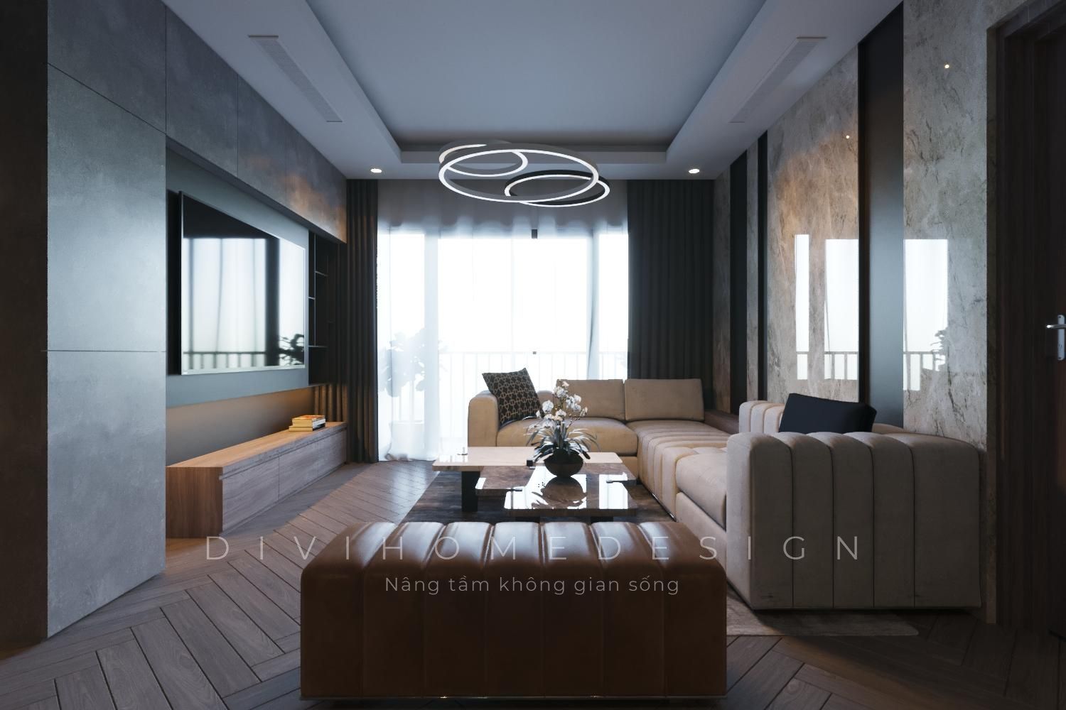 Thiết kế nội thất phòng khách mang đậm nét đặc trưng của phong cách hiện đại. Gam màu trung tính được dùng làm chủ đạo và nhấn nhá bằng tông nâu ấm phá cách mang lại sự rung cảm mạnh mẽ. Tổ chức mặt bằng theo hướng tự do, bất đối xứng nhưng mỗi món đồ đều phát huy tốt công tăng tạo nên một tổng thể hài hòa và khoa học.