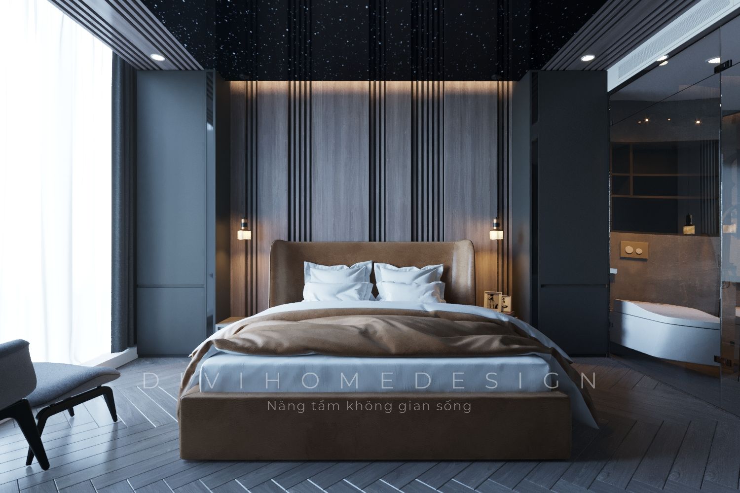 Nhà tắm được ngăn cách với phòng ngủ bằng kính cường lực trong suốt