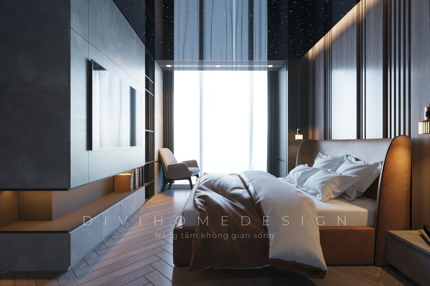 Thiết kế nội thất phòng ngủ dùng vật liệu gỗ chủ đạo kết hợp đèn vàng mang lại cảm giác gần gũi và ấm áp. Đồ nội thất có kích thước cân đối với không gian và được sắp xếp gọn gàng. Các giải pháp thiết kế tối ưu diện tích như tủ âm tường, vách ốp trang trí, kính trong suốt,... cũng được áp dụng giúp căn phòng rộng rãi hơn. Từ đó hô biến căn phòng nhỏ trở nên vô cùng tiện nghi mà vẫn thoải mái, dễ chịu.