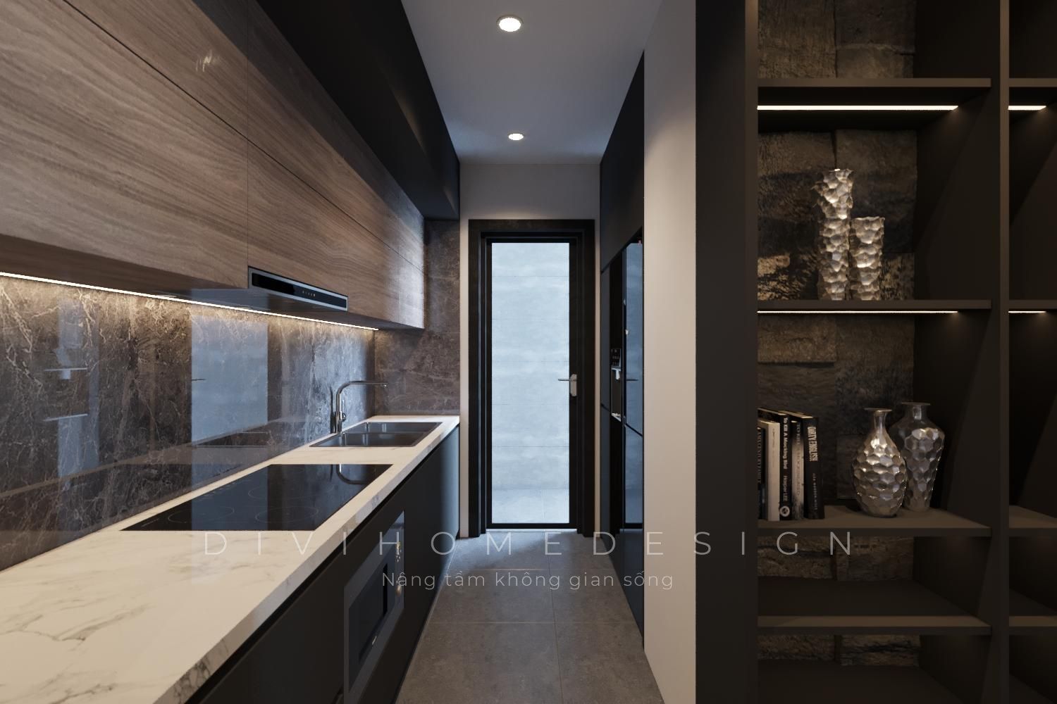 Tủ bếp chữ I kết hợp tủ âm tường song song giúp sắp xếp đồ dùng gọn gàng