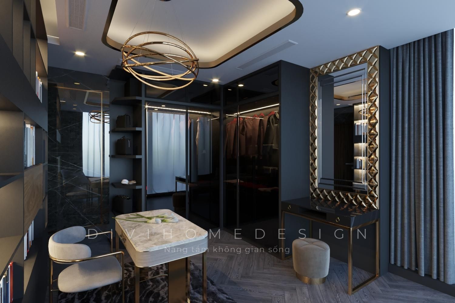 Phòng thay đồ được gia chủ đặc biệt chăm chút. Khu vực này vừa là nơi làm việc, nghỉ ngơi và lưu giữ những món đồ yêu thích. Đồ nội thất có kích thước nhỏ gọn với các đường nét thiết kế tinh tế, vừa phát huy tốt công năng vừa mang giá trị thẩm mỹ cao.