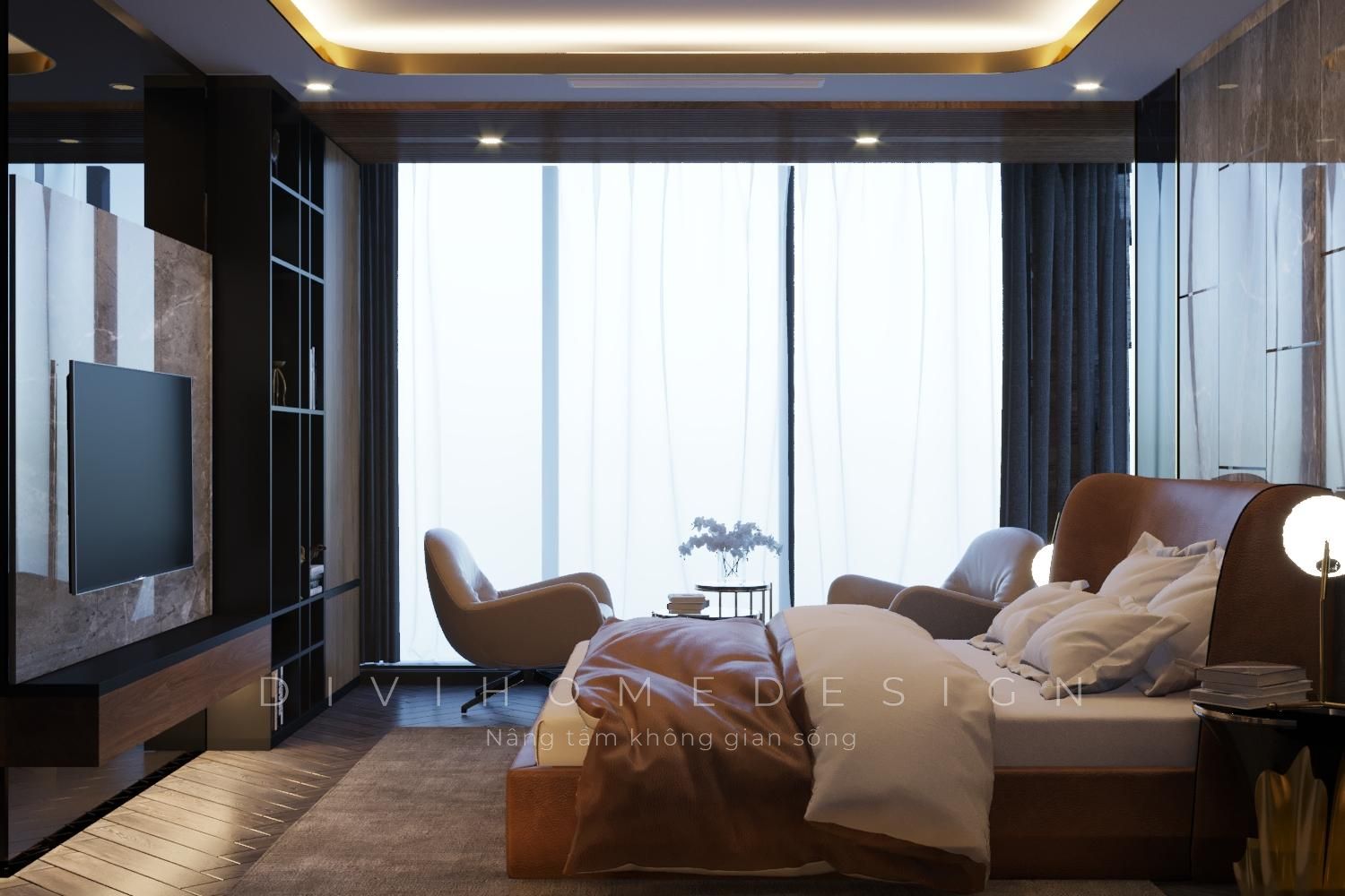 Thiết kế nội thất phòng ngủ tập trung vào công năng nghỉ ngơi và thư giãn. Phòng ngủ lấy tông màu trầm chủ đạo. Vật liệu gỗ và đá được sử dụng xen kẽ cho mặt sàn, tường và trần mang lại cảm giác gần gũi, ấm cúng. Không có nhiều đồ vật, một chiếc giường lớn và sự thông thoáng chính là công thức lý tưởng tạo nên không gian này.