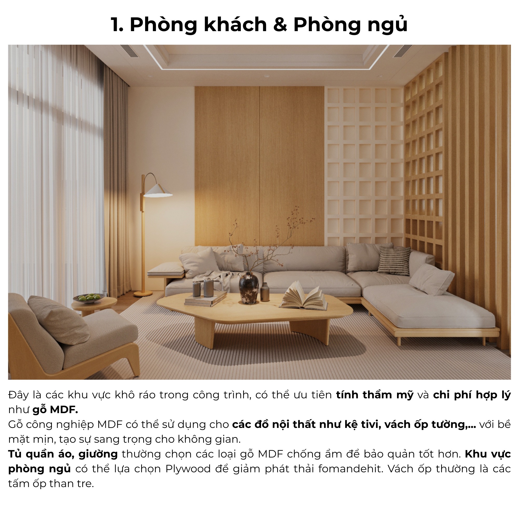 Phòng khách và phòng ngủ là những khu vực khô ráo nhất trong công trình. Đây là nơi gia chủ có thể thoải mái ưu tiên tính thẩm mỹ và chi phí hợp lý.