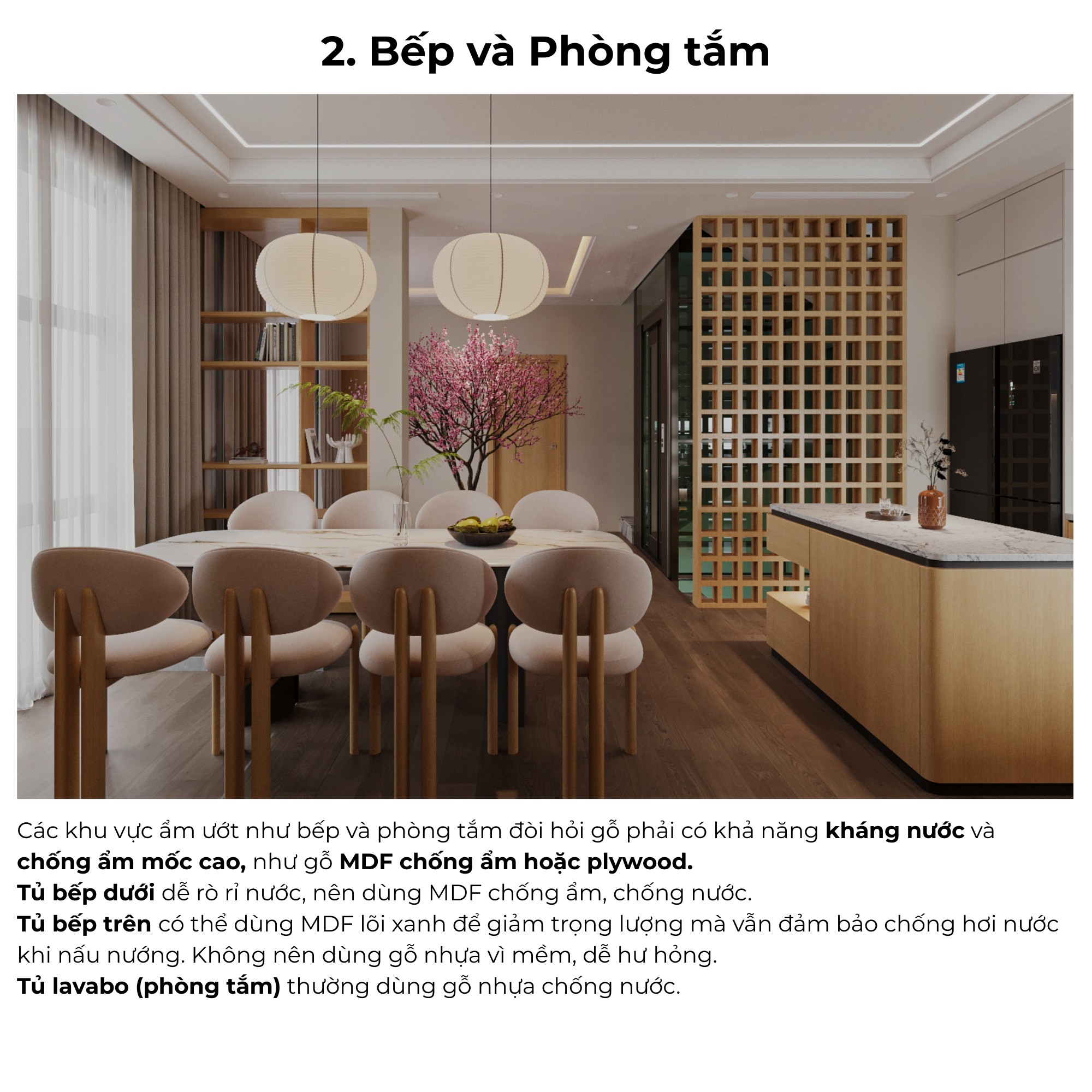 Bếp và phòng tắm là hai khu vực "khó chiều" nhất vì thường xuyên tiếp xúc với nước và hơi nóng. Việc chọn sai vật liệu ở đây sẽ dẫn đến tình trạng mục nát, nở gỗ chỉ sau một thời gian ngắn sử dụng.
