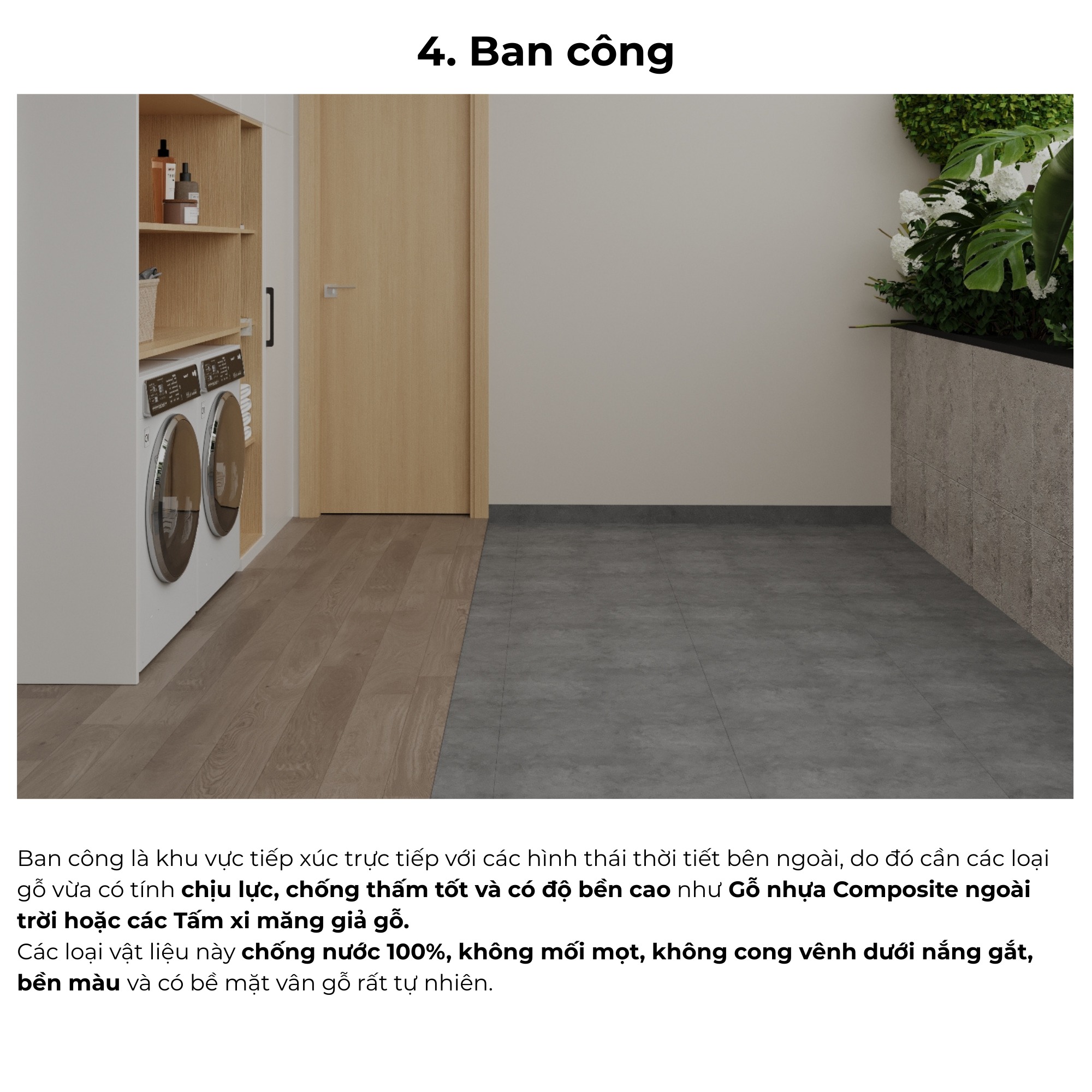 Gỗ nhựa Composite ngoài trời & Tấm xi măng giả gỗ: Đây là "vị cứu tinh" cho không gian ban công xanh mát. Các loại vật liệu này sở hữu những ưu điểm vượt trội: