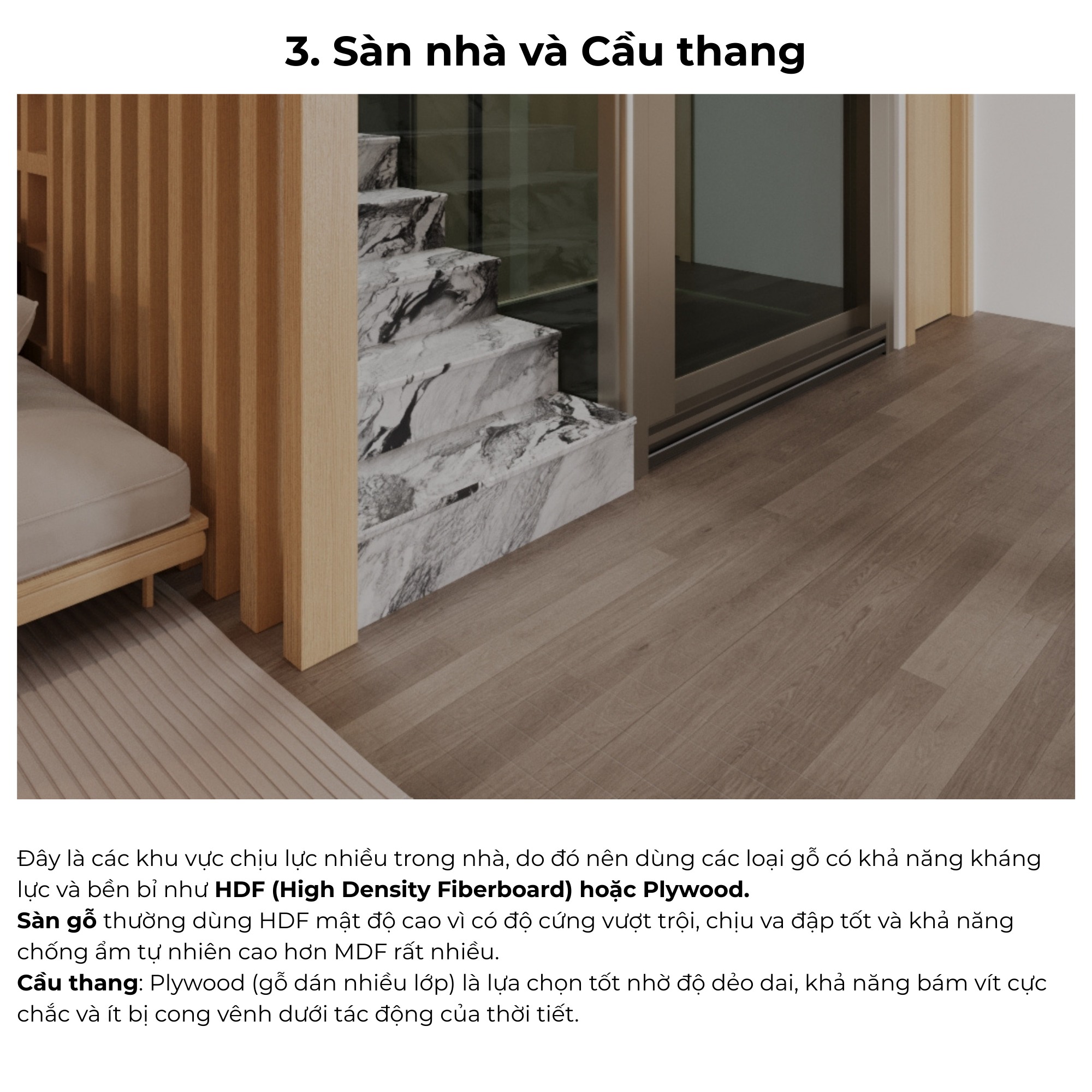 Sàn nhà và cầu thang là nơi chịu mật độ đi lại lớn và va đập thường xuyên. Do đó, tiêu chí hàng đầu khi chọn gỗ ở đây là độ cứng và khả năng chịu lực.