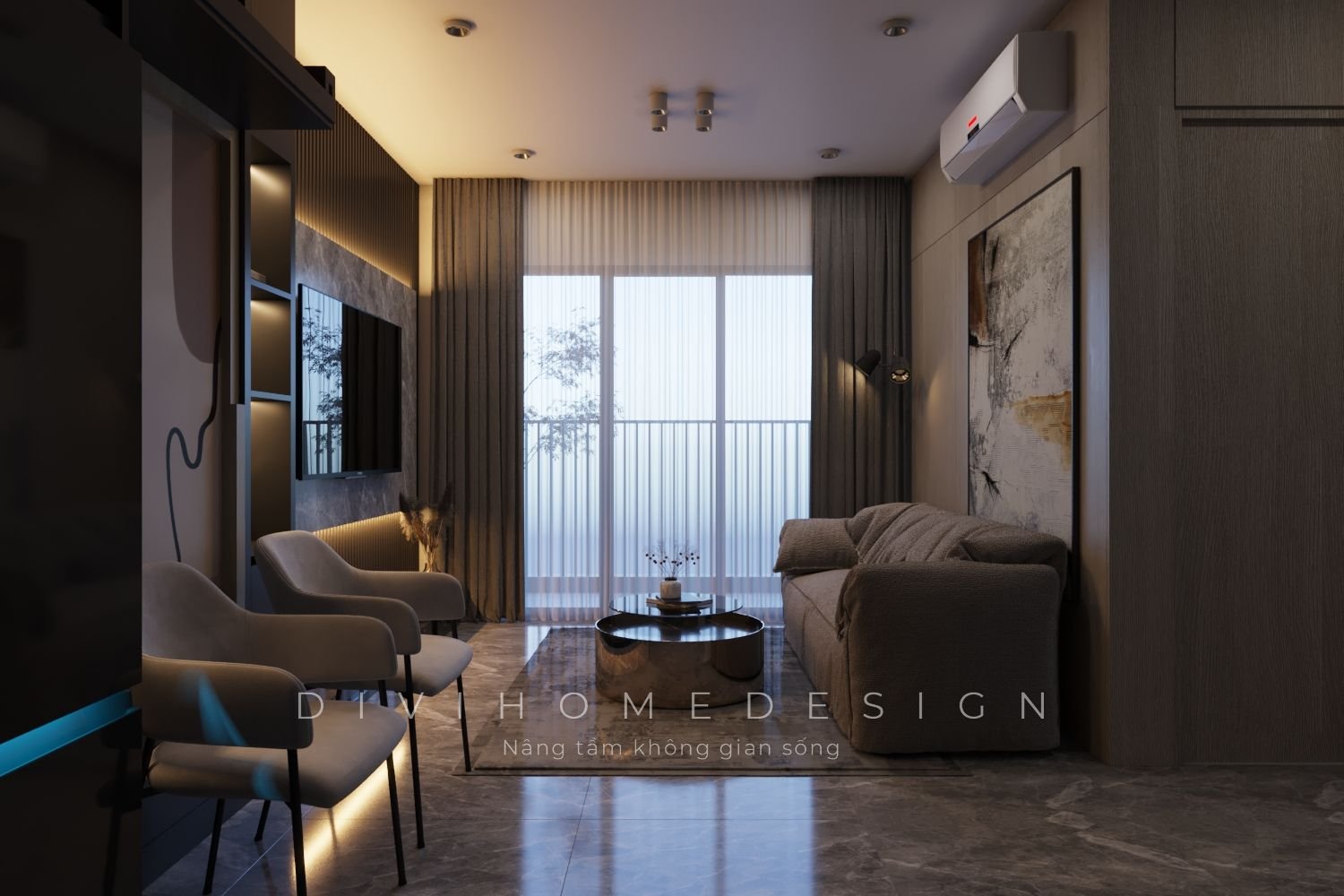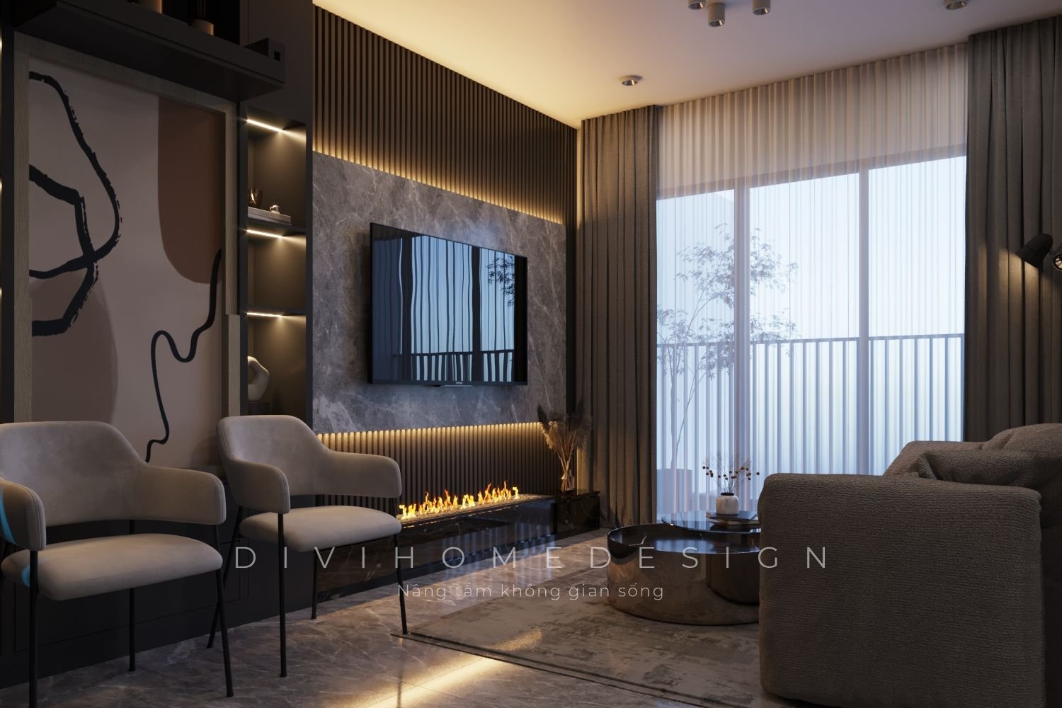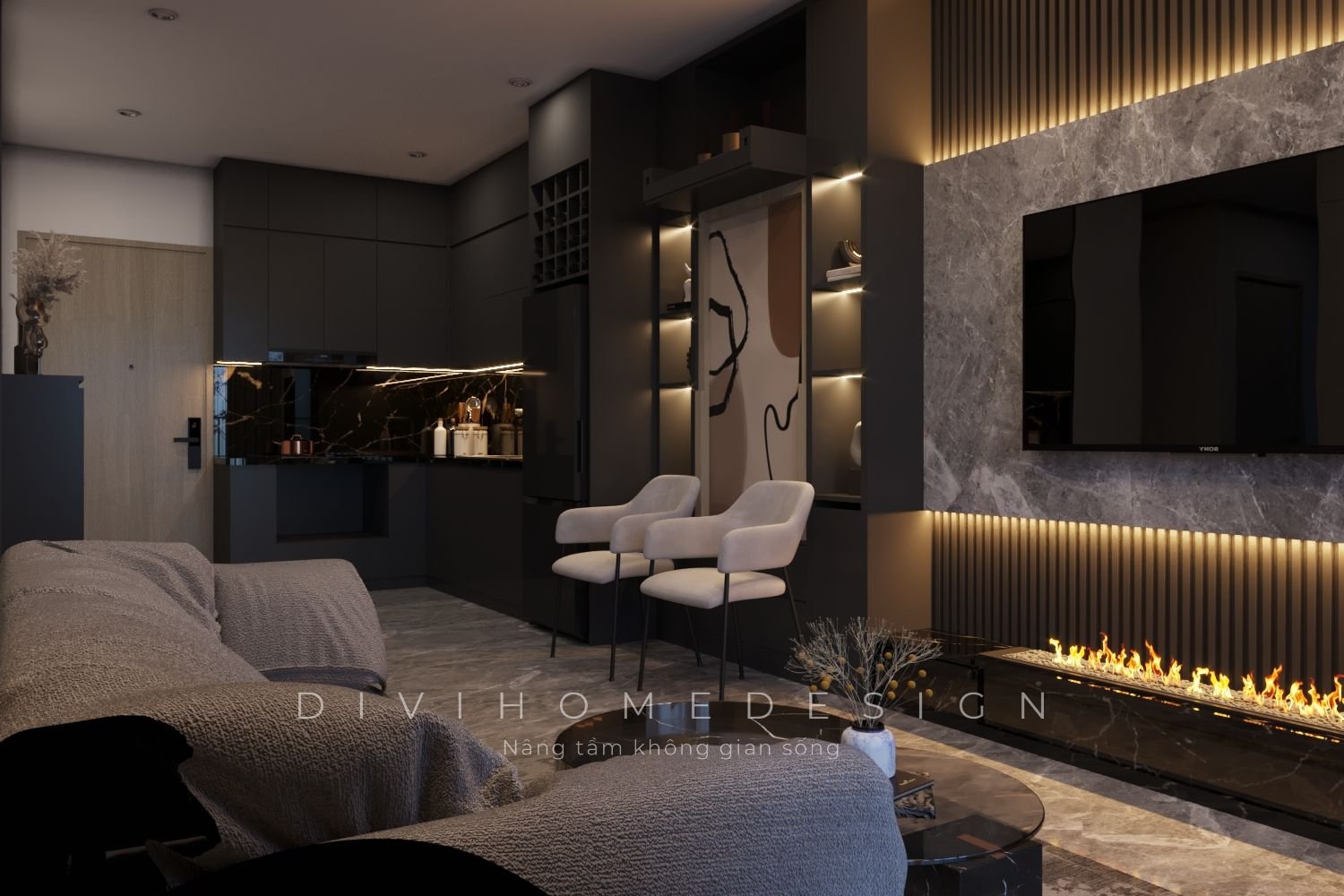 Bài toán diện tích luôn là điều được nhắc đến nhiều nhất khi thiết kế nội thất chung cư. Đặc biệt với các căn hộ 60m2 được phân chia thành 2 phòng ngủ, không gian sinh hoạt chung càng hạn chế. Vì vậy để tối ưu, các KTS của Divihome đã lựa chọn cấu trúc không gian mở cho căn hộ. Ngoài ra các yếu tố khác cũng được tối đa hóa bằng hệ thống tủ kệ kịch trần, sử dụng tivi, tranh treo tường,...