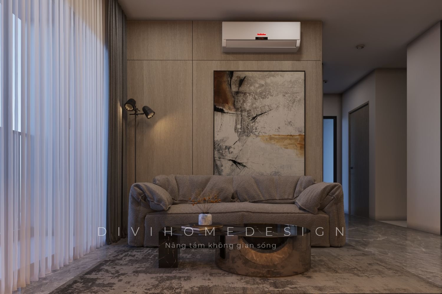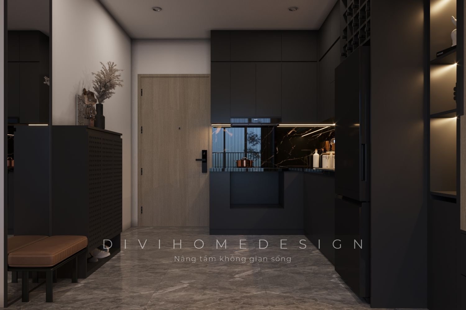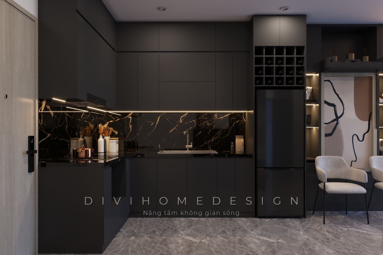 Bài toán diện tích luôn là điều được nhắc đến nhiều nhất khi thiết kế nội thất chung cư. Đặc biệt với các căn hộ 60m2 được phân chia thành 2 phòng ngủ, không gian sinh hoạt chung càng hạn chế. Vì vậy để tối ưu, các KTS của Divihome đã lựa chọn cấu trúc không gian mở cho căn hộ. Ngoài ra các yếu tố khác cũng được tối đa hóa bằng hệ thống tủ kệ kịch trần, sử dụng tivi, tranh treo tường,...