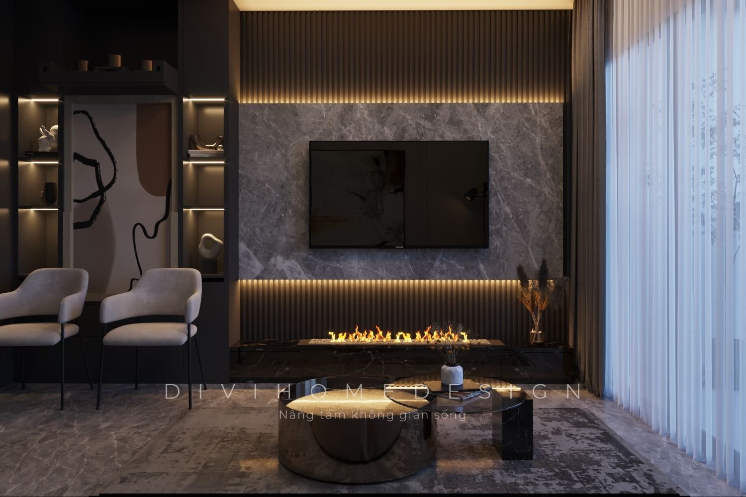 Phòng khách được bố trí bên cửa sổ chính của ngôi nhà. Cửa sổ được thiết kế kịch trần và sử dụng vật liệu kính cường lực trong suốt để đón nhận ánh sáng. Hệ thống rèm hai lớp giúp điều chỉnh ánh sáng phù hợp theo thời điểm trong ngày và nhu cầu của gia chủ. Thiết kế này không chỉ giúp ngôi nhà thoáng đãng mà còn tiết kiệm điện năng hiệu quả.