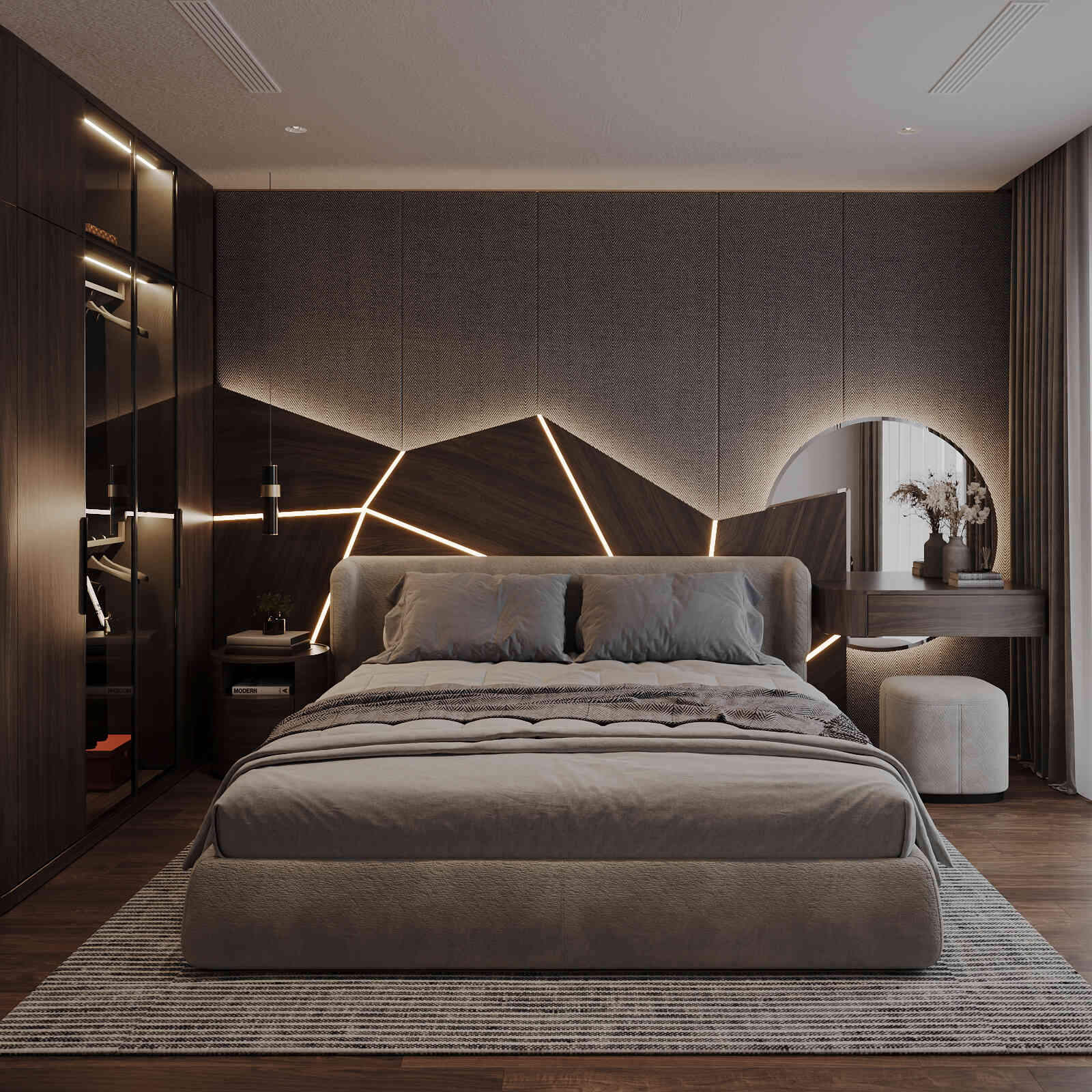 Vật liệu ốp tường phòng ngủ này có tính thẩm mỹ độc đáo và hiện đại, có thể kết hợp với hệ thống đèn chiếu sáng để tạo hiệu ứng ánh sáng đẹp mắt, làm tăng thêm vẻ ấm cúng và lãng mạn cho phòng ngủ. Tuy nhiên, nó thường hạn chế về kiểu dáng và kích thước so với vật liệu tự nhiên.