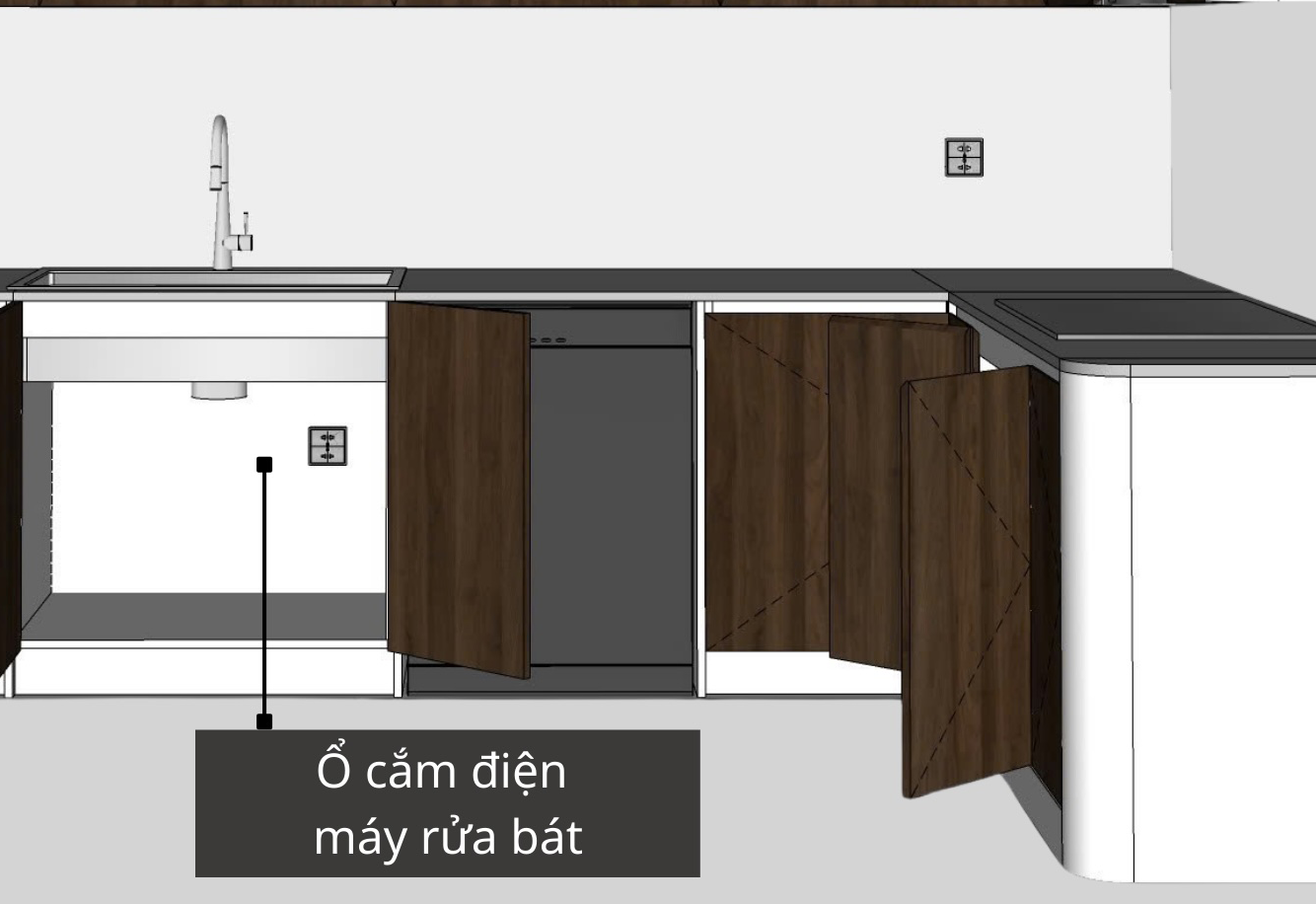 - Vị trí: Tuyệt đối không đặt ổ cắm ngay phía sau máy rửa bát vì máy cần đẩy sát tường và có nguy cơ rò rỉ nước từ phía sau. Vị trí tốt nhất là ở khoang tủ dưới của bồn rửa chén ngay cạnh đó.