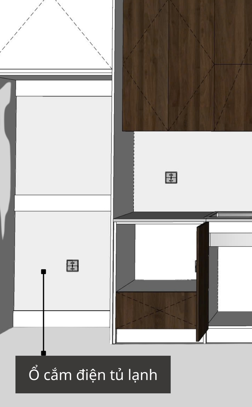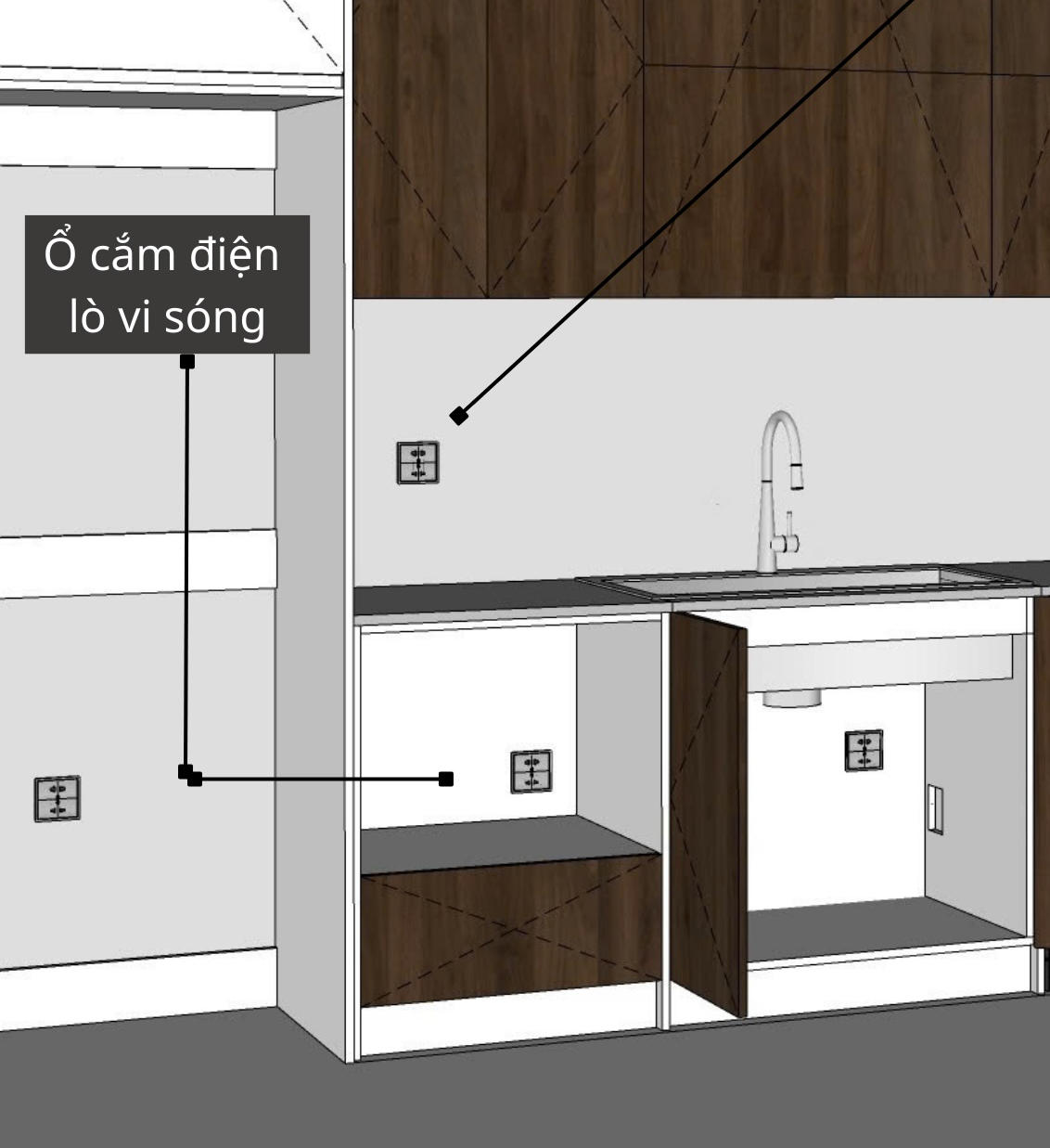 - Vị trí: Nếu lò vi sóng để trên bàn bếp, ổ cắm nên đặt ngay phía sau hoặc bên cạnh. Nếu là lò vi sóng âm tủ, ổ cắm nên được giấu trong khoang tủ lân cận hoặc ngay phía sau khoang lò (nhưng phải trừ hao độ sâu của tủ).