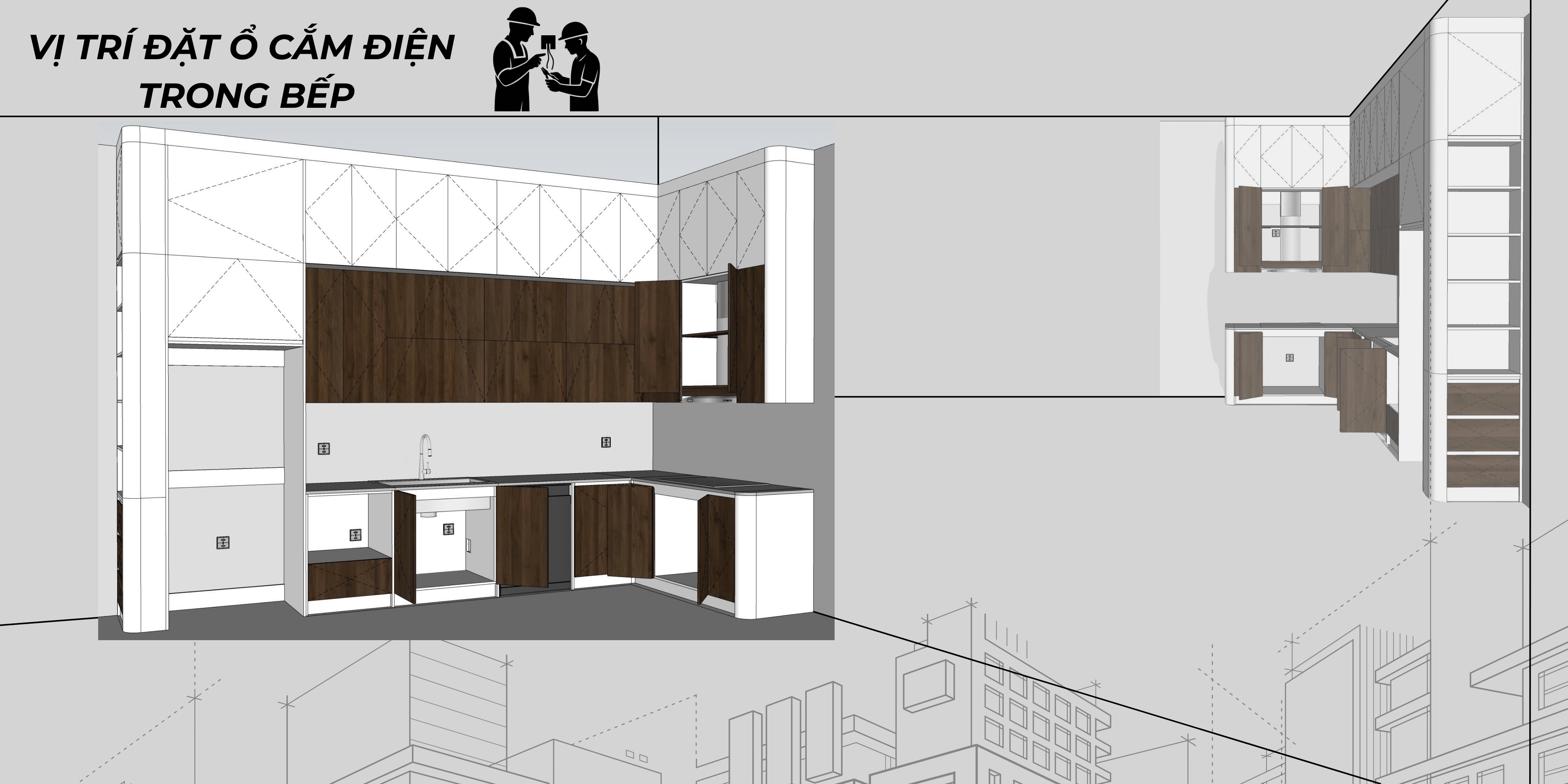- Số lượng: Nên lắp cụm ổ cắm đôi hoặc ba tại ít nhất 2 vị trí khác nhau để có thể dùng nhiều máy cùng lúc (ví dụ: vừa nấu cơm vừa xay sinh tố).