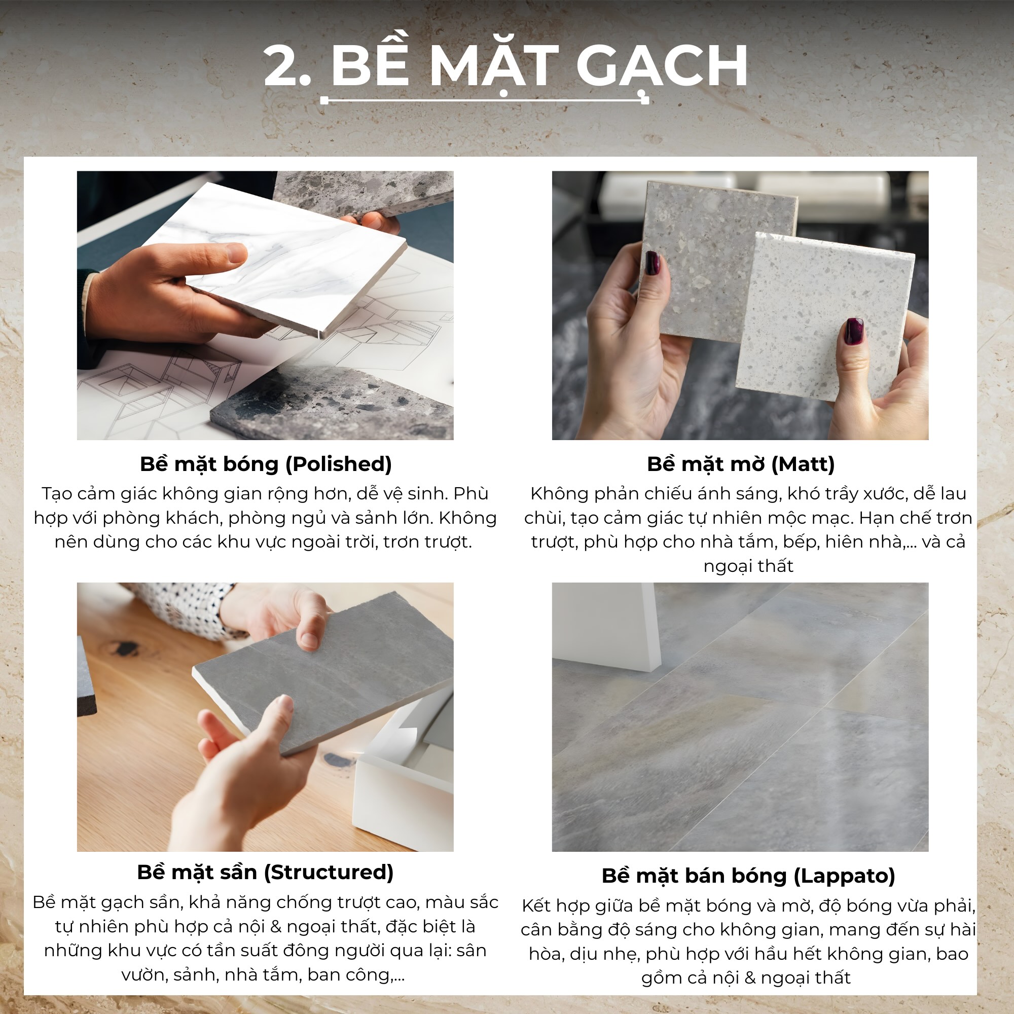 Việc lựa chọn bề mặt gạch phù hợp không chỉ quyết định tính thẩm mỹ mà còn ảnh hưởng trực tiếp đến sự an toàn và tiện lợi trong sinh hoạt.Dưới đây là các lưu ý quan trọng khi lựa chọn 4 loại bề mặt gạch phổ biến: