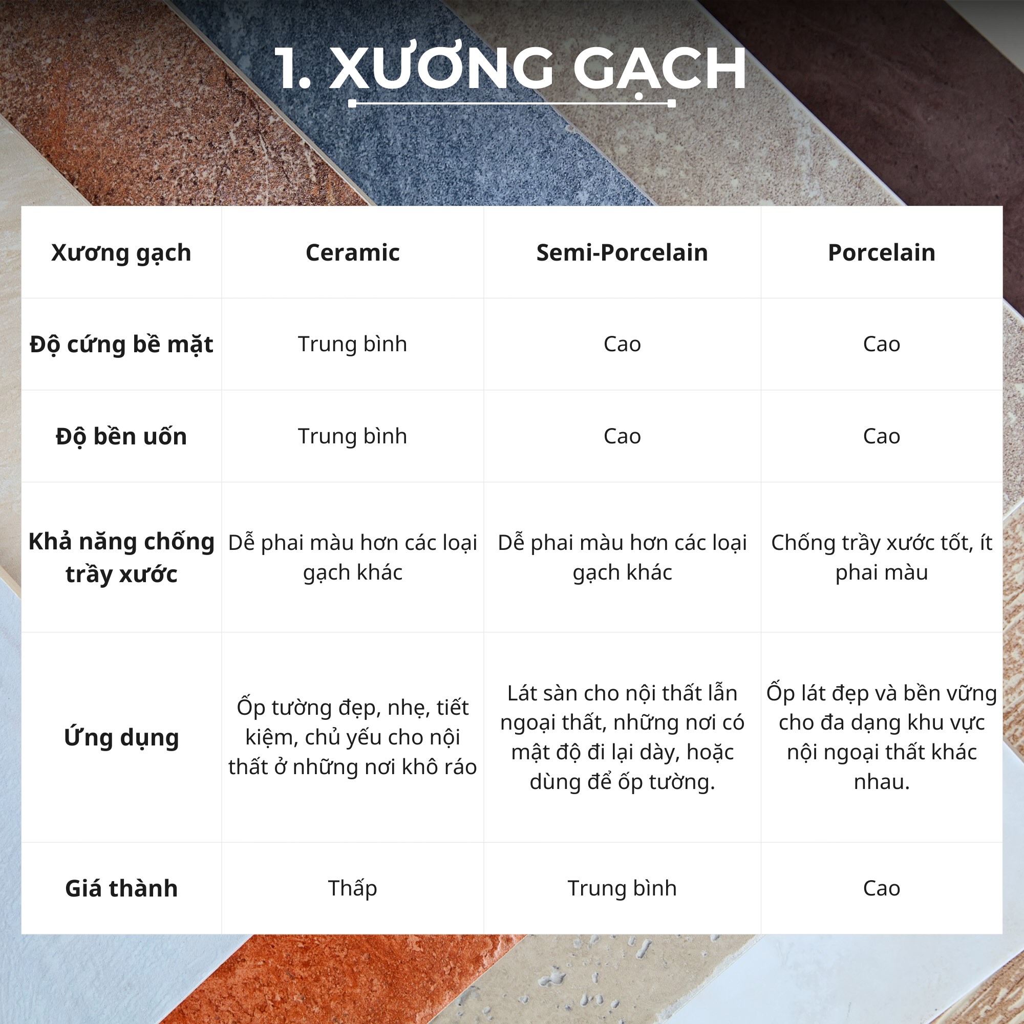 Cùng theo dõi bảng tổng hợp dưới đây để có những lưu ý khi lựa chọn xương gạch bạn nhé!