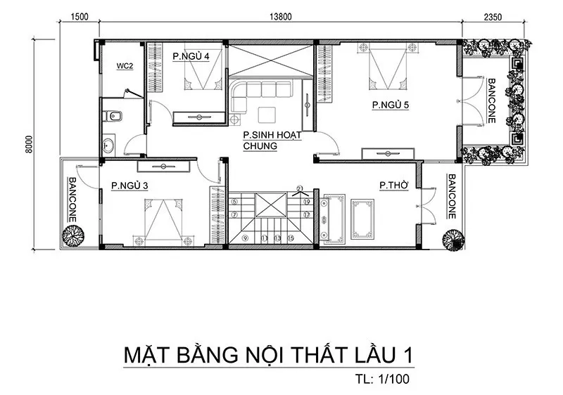 Bản vẽ bố trí công năng mẫu nhà phố 5 phòng ngủ 3 tầng phong cách hiện đại