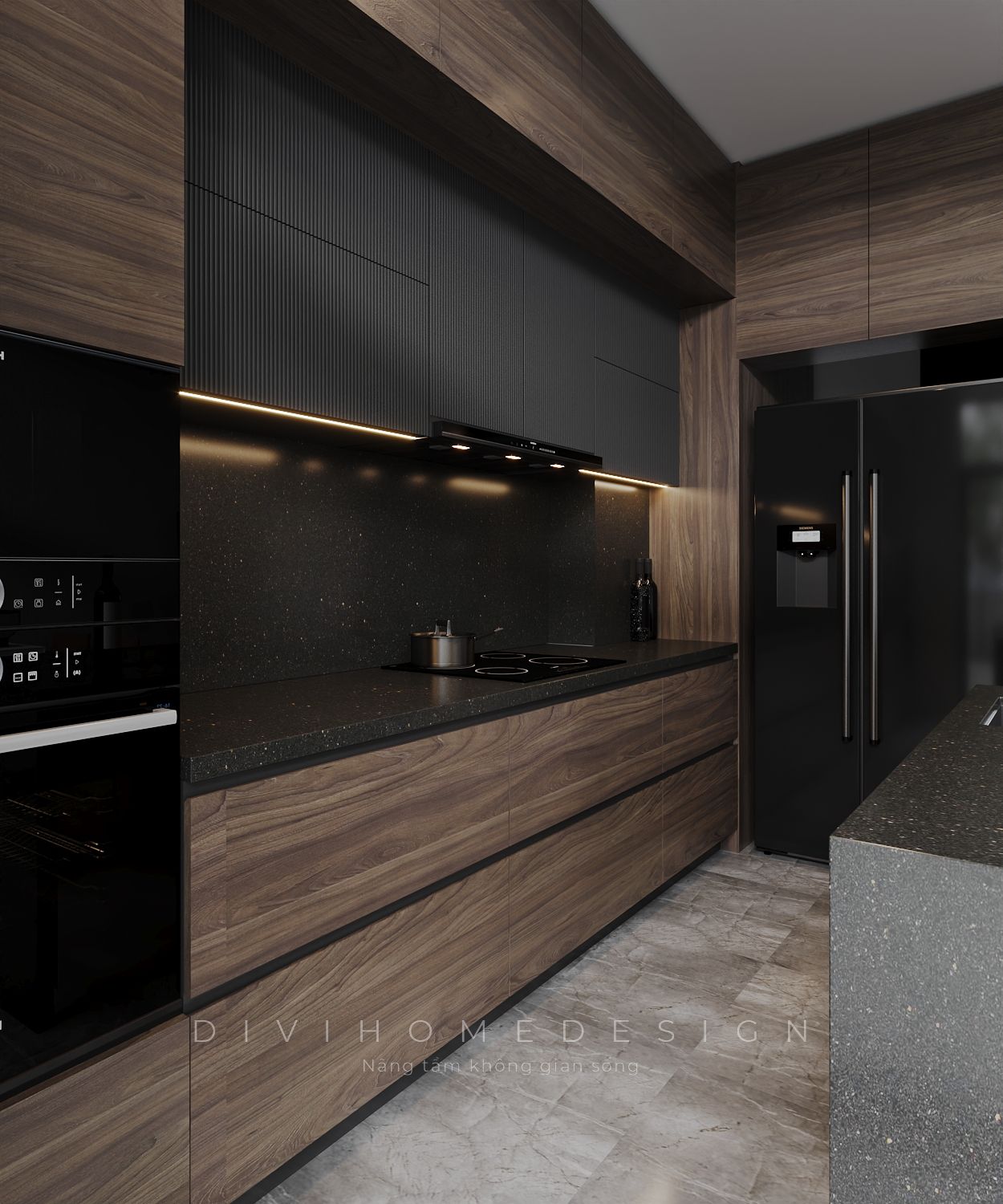 Tủ bếp gỗ MDF với lớp phủ Melamine họa tiết vân gỗ sang trọng