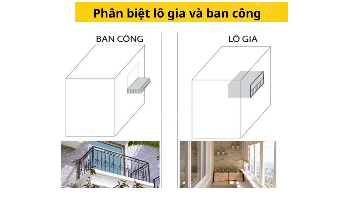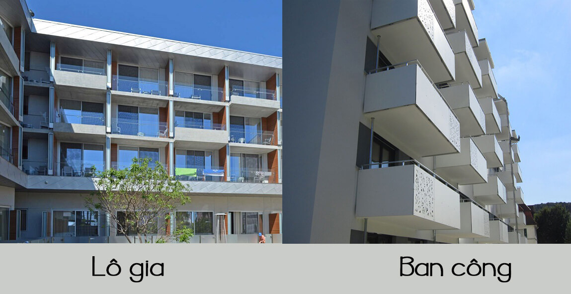 Chúng ta có thể dựa vào kết cấu kiến trúc để phân biệt ban công và lô gia. Nếu như ban công là không gian nhô ra ngoài bức tường, thì lô gia lại được xây dựng âm bên trong mặt bằng ngôi nhà. Lô gia luôn có phần mái che chắn và tầm nhìn chỉ có một phía. Do đó, ưu điểm của lô gia hạn chế nước mưa tạt vào và nhược điểm là tầm nhìn chỉ có một hướng.