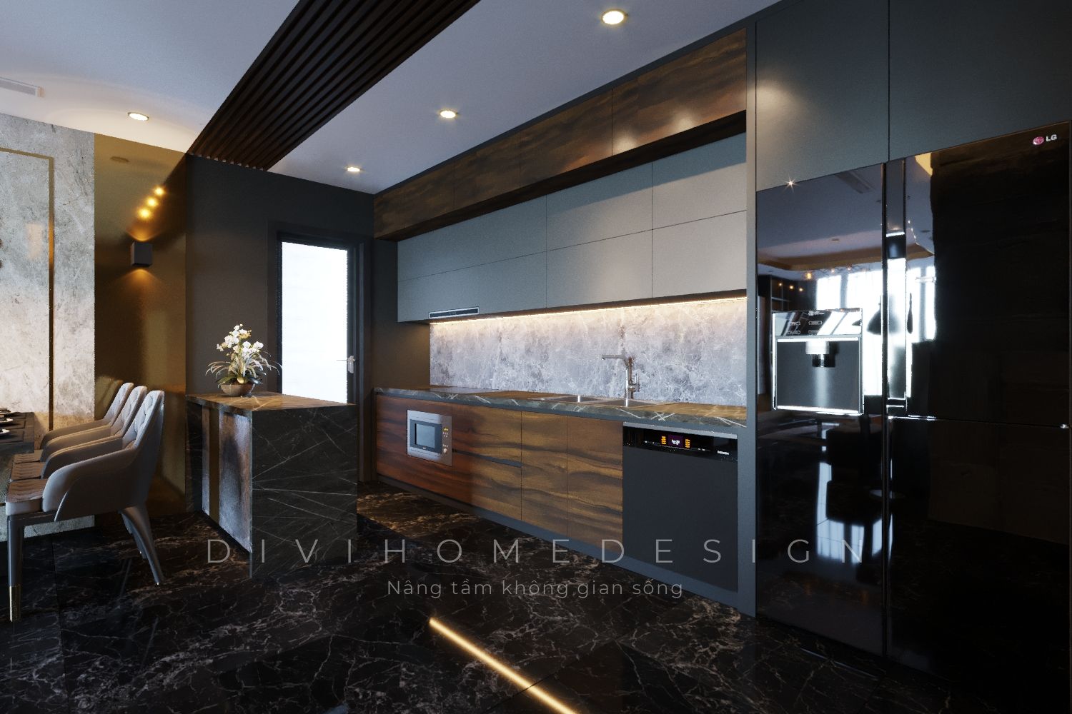 Không gian bếp là sự kết hợp giữa tính tiện nghi và tính thẩm mỹ. Các thiết bị hiện đại và tiện ích như tủ lạnh, lò vi sóng và máy rửa bát được tích hợp một cách tinh tế vào không gian bếp. Bàn ăn và quầy bar được làm từ đá tự nhiên kết hợp với ghế ăn bọc da Ý để tạo ra không gian ẩm thực sang trọng.