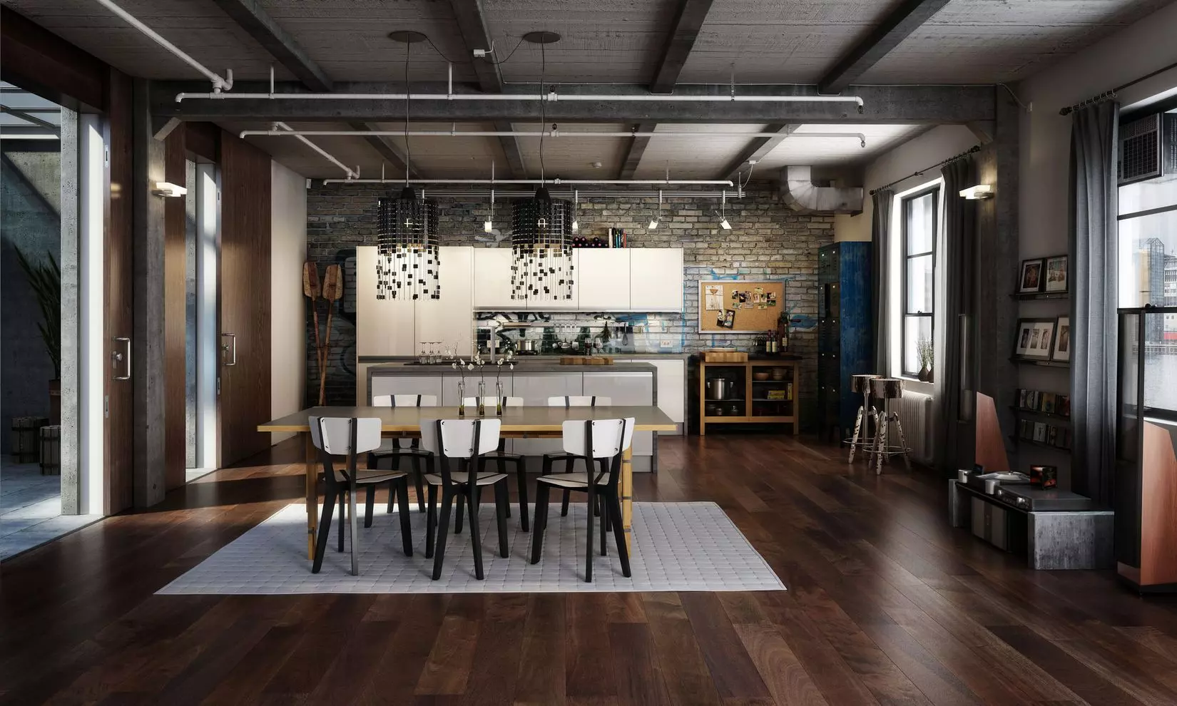 Phong cách công nghiệp lấy cảm hứng từ các nhà máy và kho xưởng cũ, với sự sử dụng của thép không gỉ, gỗ thô và bê tông. Phong cách này thường có các đường nét cứng cáp và màu sắc tối giản, tạo ra không gian sống mạnh mẽ và hiện đại.