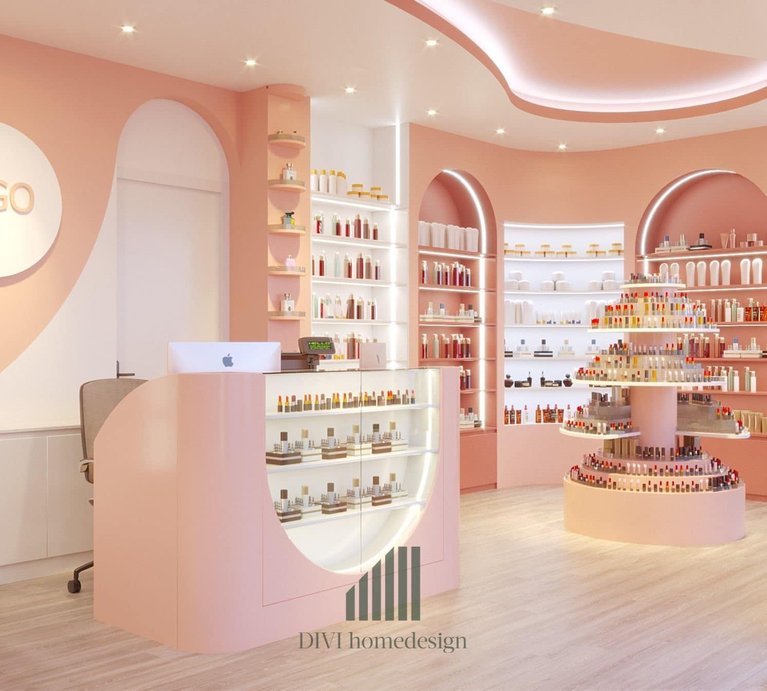 Nội thất cửa hàng mỹ phẩm với cách bố trí màu sắc tương ứng với nhận diện thương hiệu