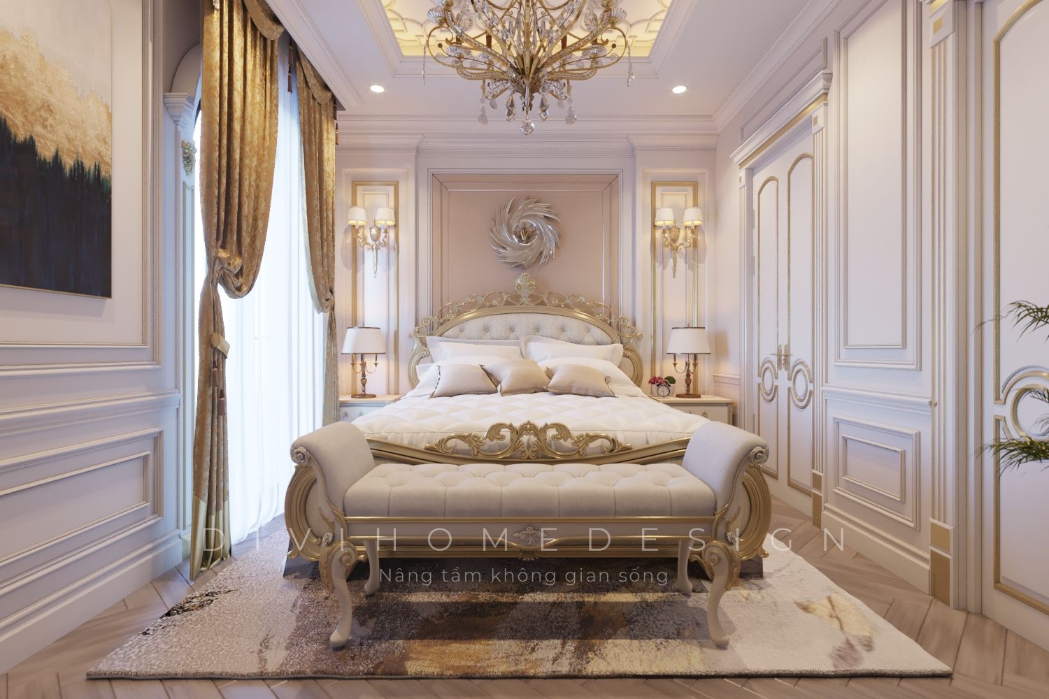 Phòng ngủ là sự kết hợp của các yếu tố như chất liệu và hoa văn cổ điển với các đường nét hiện đại và tinh tế. Giường ngủ được lựa chọn với các đường cong mềm mại và chất liệu vải cotton cao cấp. Tủ quần áo được thiết kế đồng bộ tạo ra không gian sống lịch lãm và tiện nghi.
