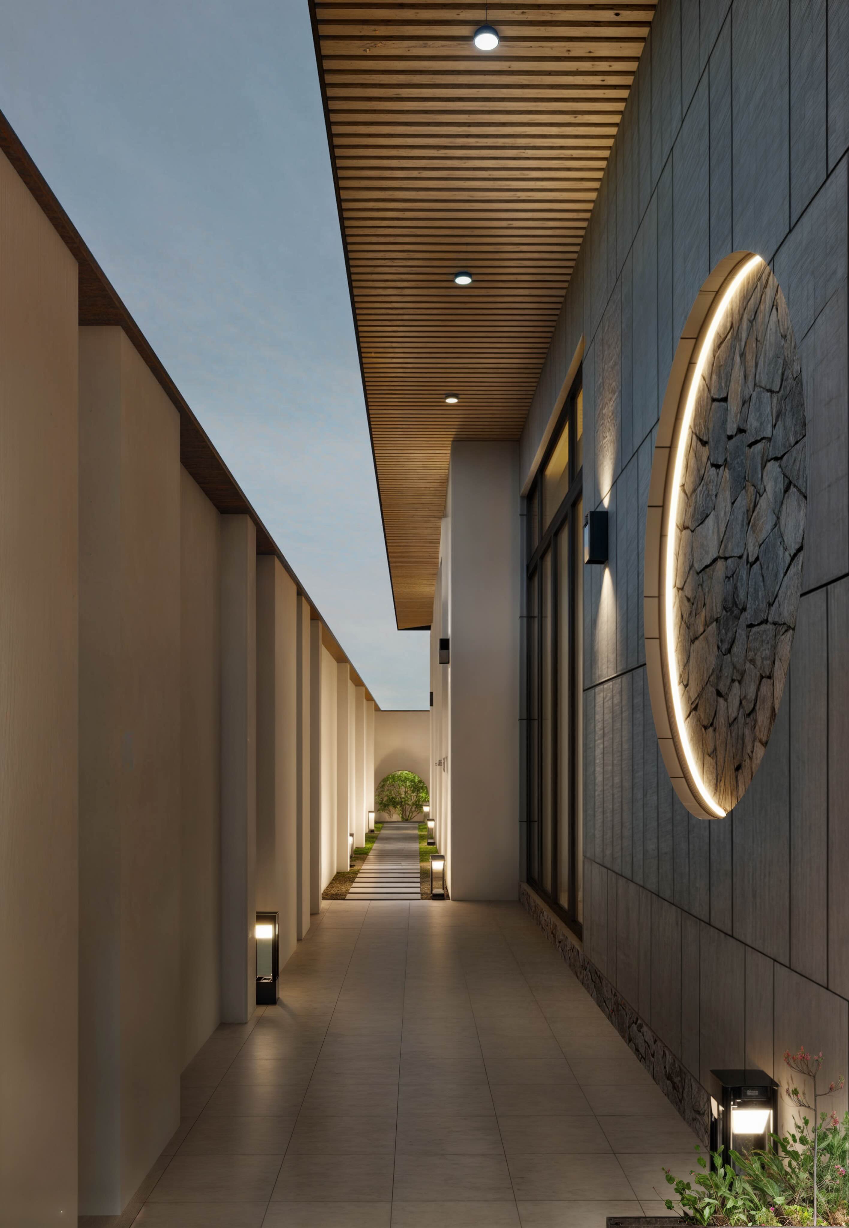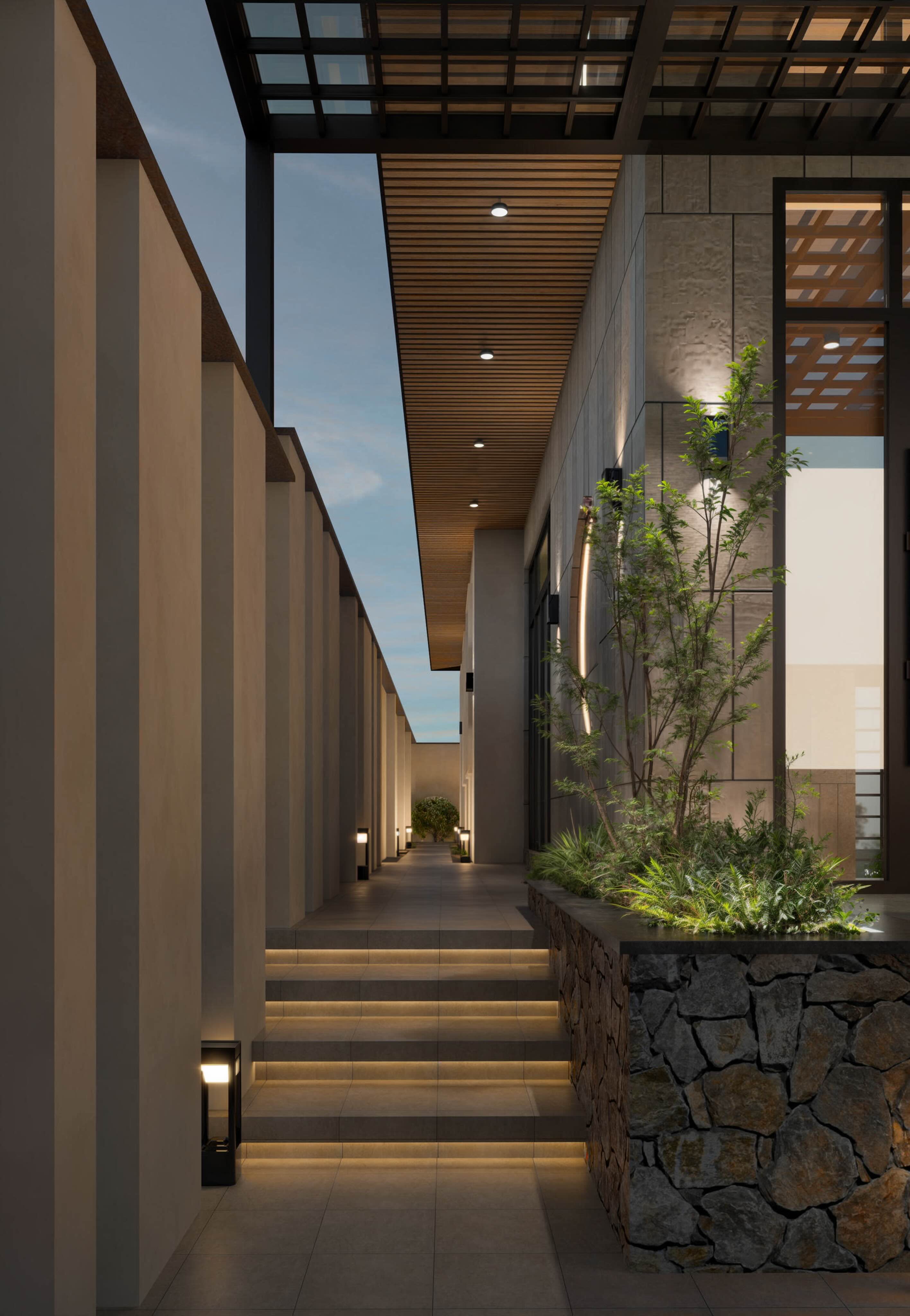 Hệ thống đèn tường dọc hàng rào, đèn chiếu sáng âm sàn và đèn hắt cây xanh tạo hiệu ứng thị giác lung linh, làm nổi bật kết cấu của công trình.
