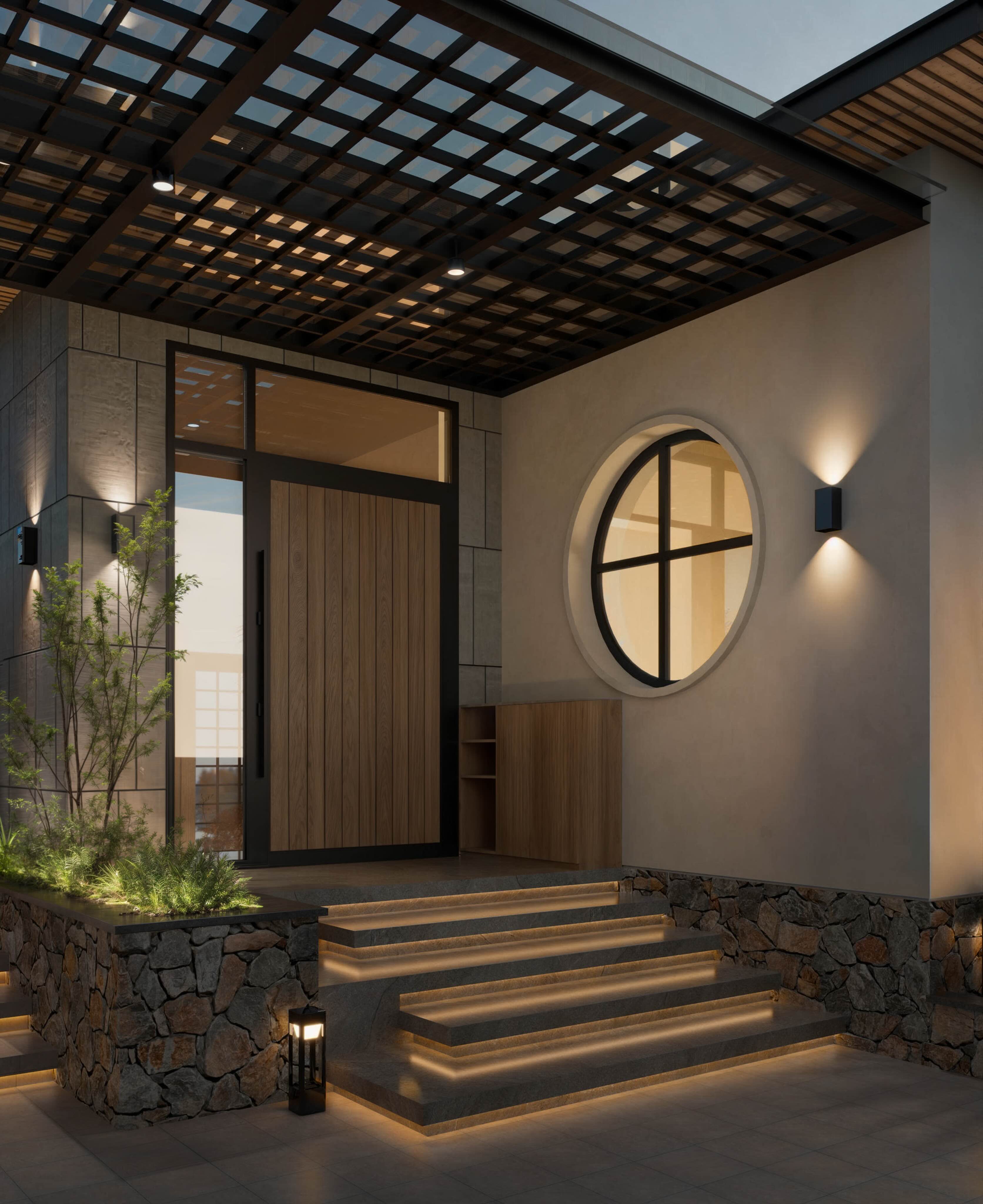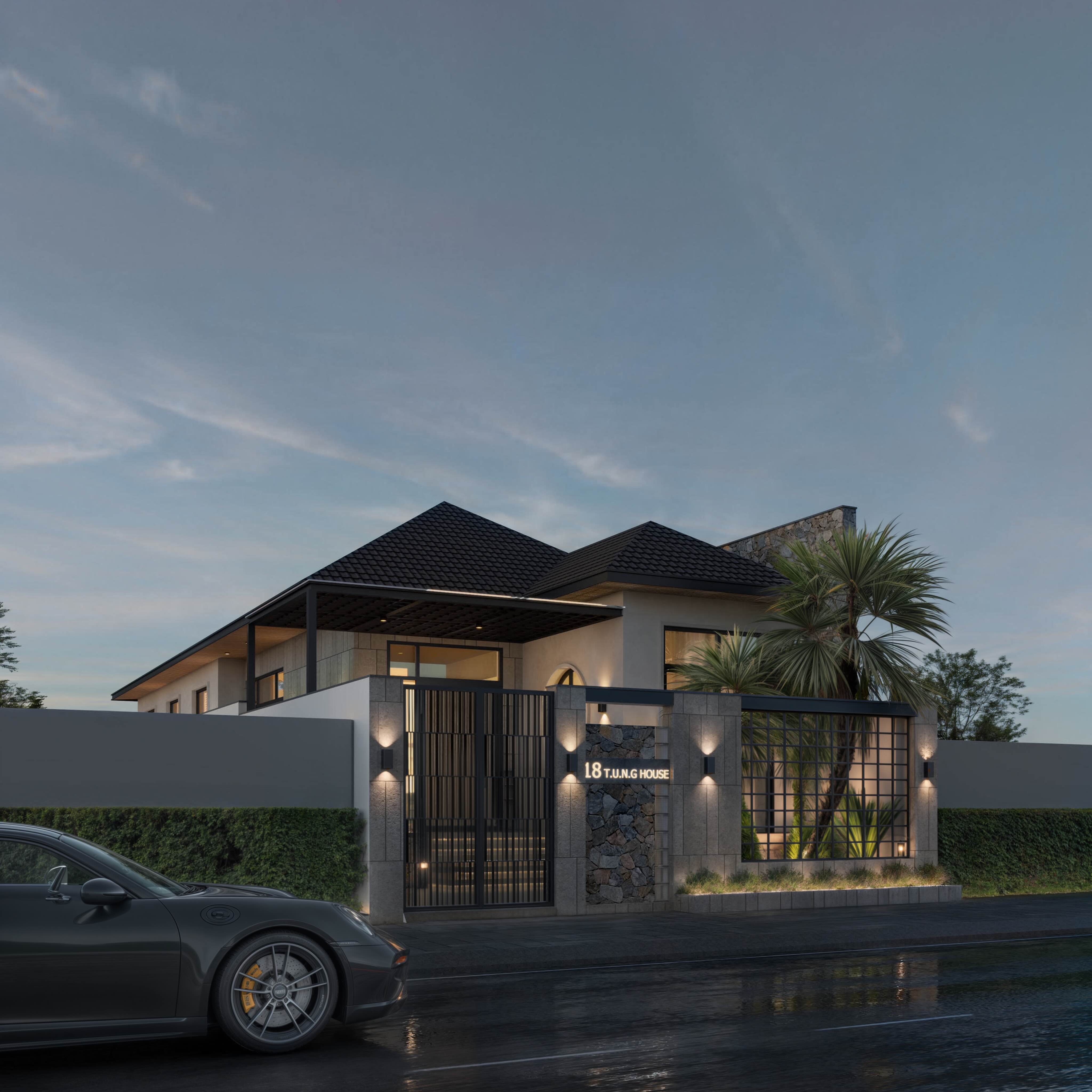 Mặt tiền ấn tượng: Sự kết hợp hài hòa giữa tường rào đá tự nhiên và khung kim loại tạo nên vẻ ngoài vững chãi, hiện đại và cực kỳ thu hút.
