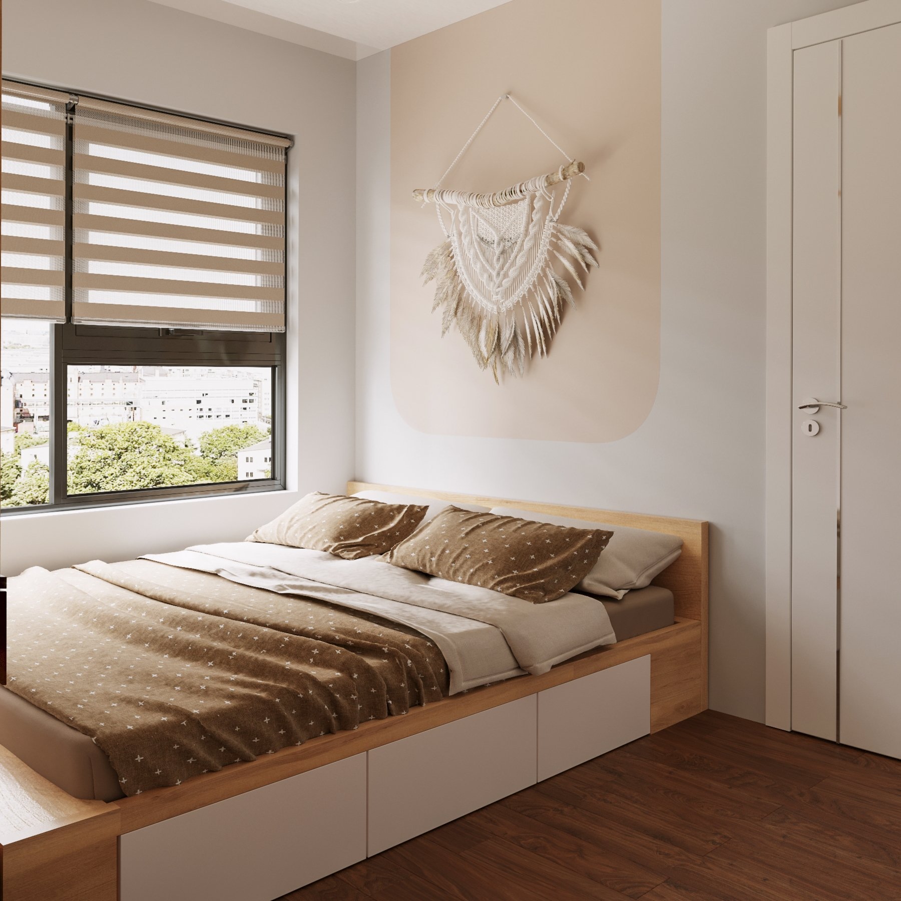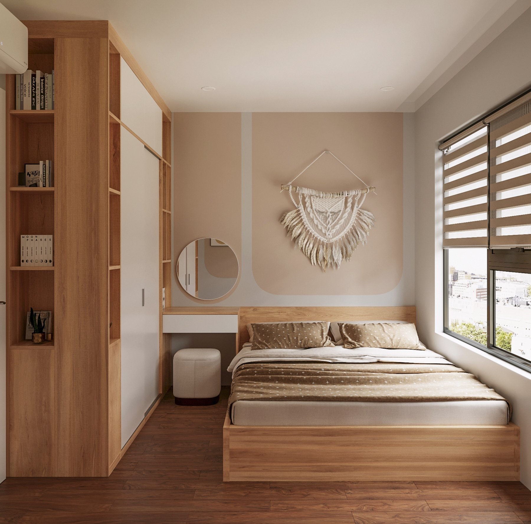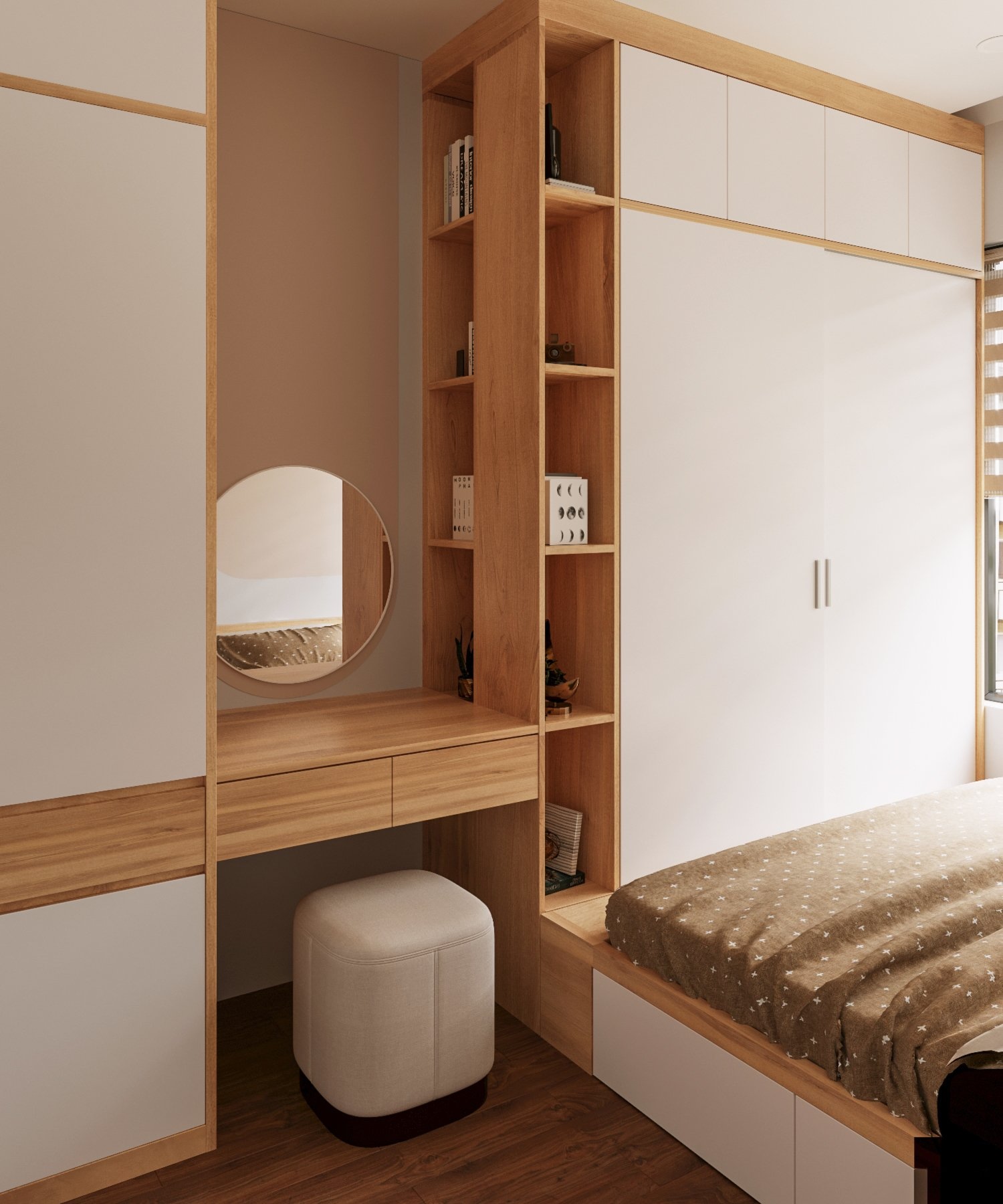 Gỗ công nghiệp, vải trắng tone màu nâu - xám - trắng vừa ấm áp, vừa tươi sáng là đặc trưng của phong cách Địa Trung Hải được sử dụng cho căn phòng.