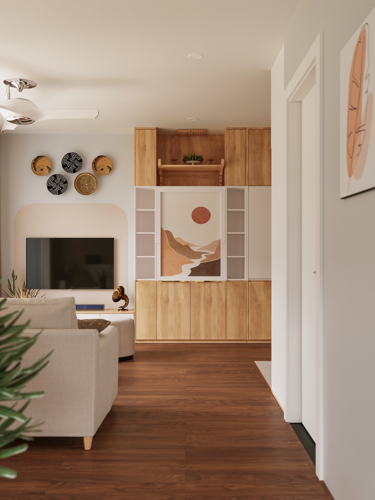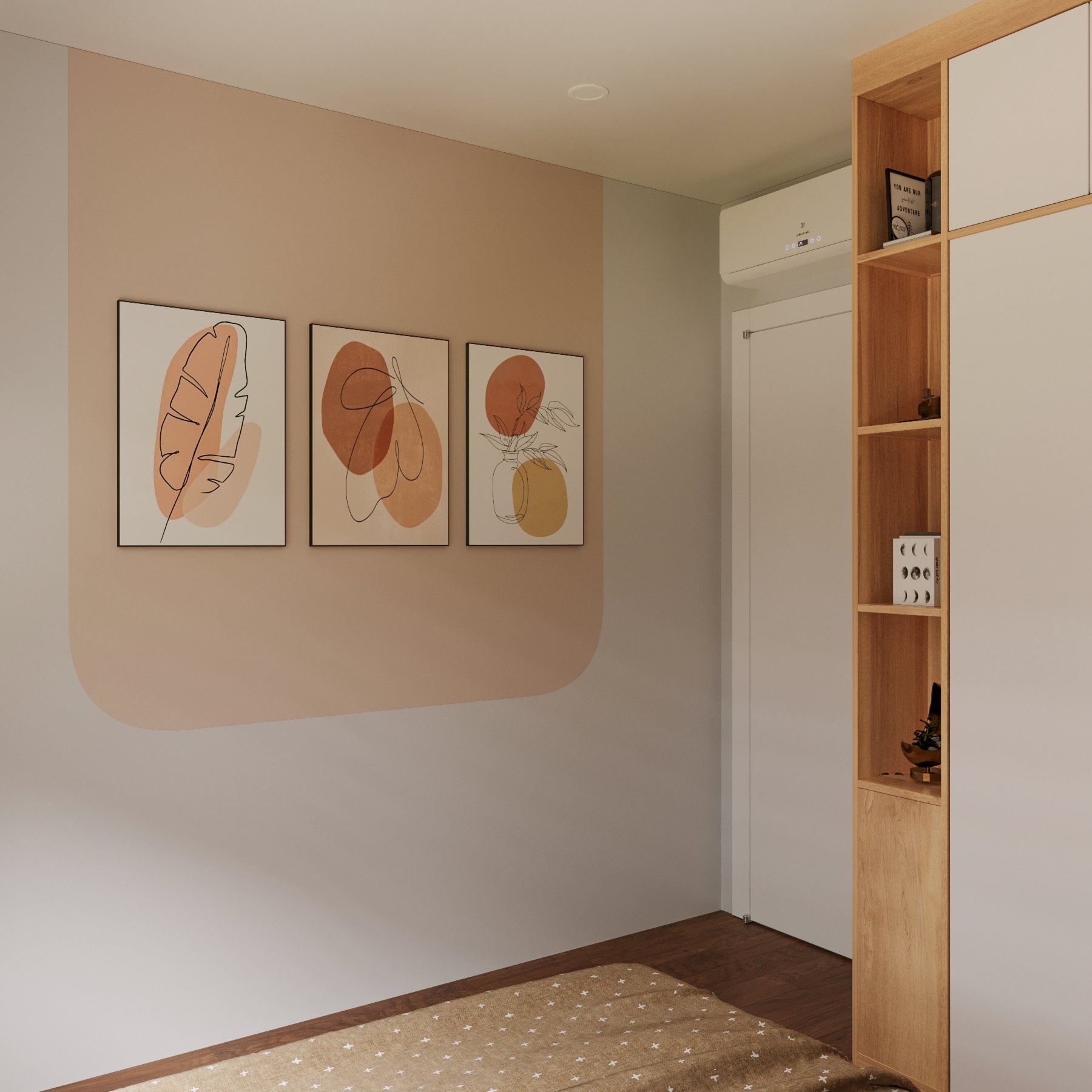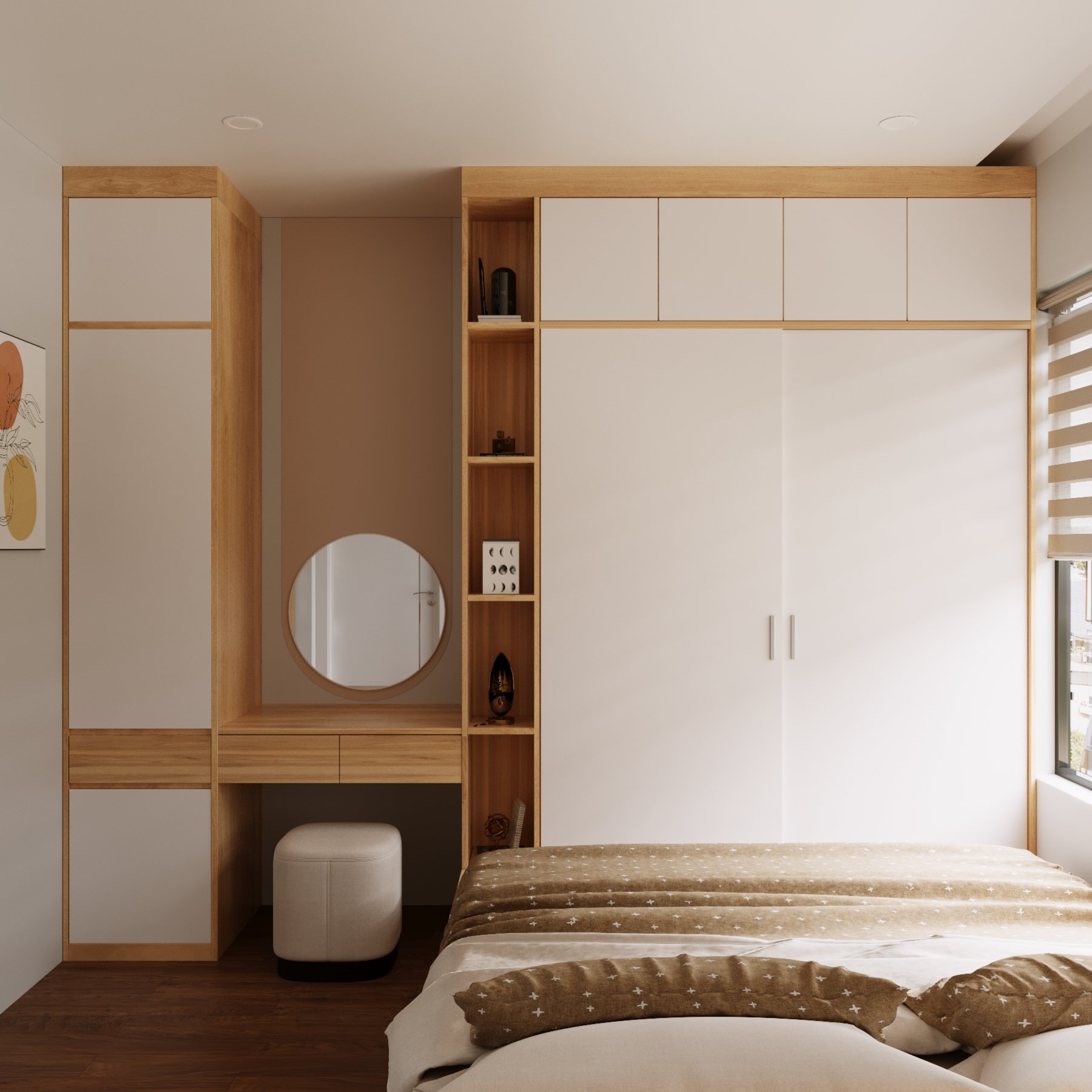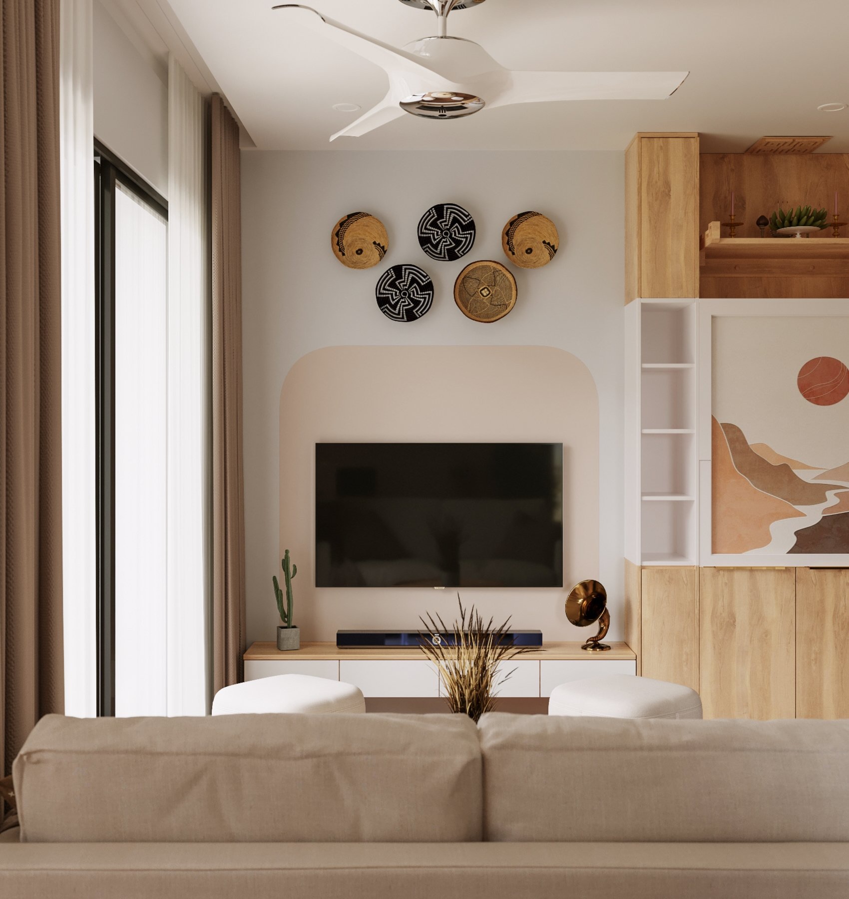 Gỗ công nghiệp, vải trắng tone màu nâu - xám - trắng vừa ấm áp, vừa tươi sáng là đặc trưng của phong cách Địa Trung Hải được sử dụng cho căn phòng.