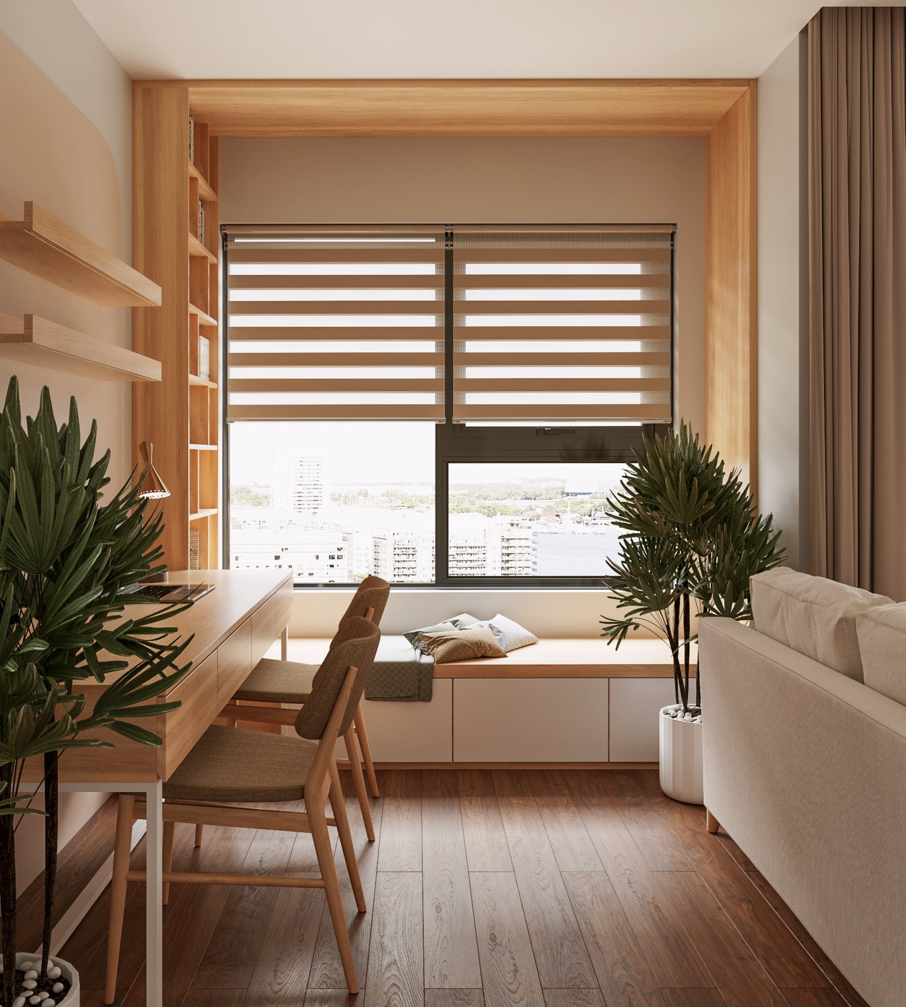 Rèm cửa cũng sử dụng chất liệu gỗ thân thiện và gần gũi.