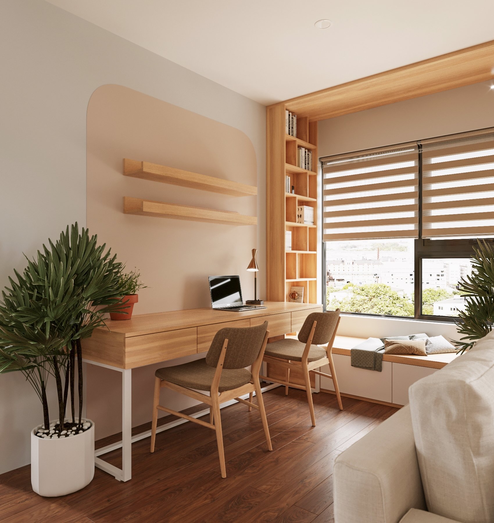 Bàn làm việc và kệ tạo nên một góc làm việc rất chil và nhẹ nhàng cho công trình