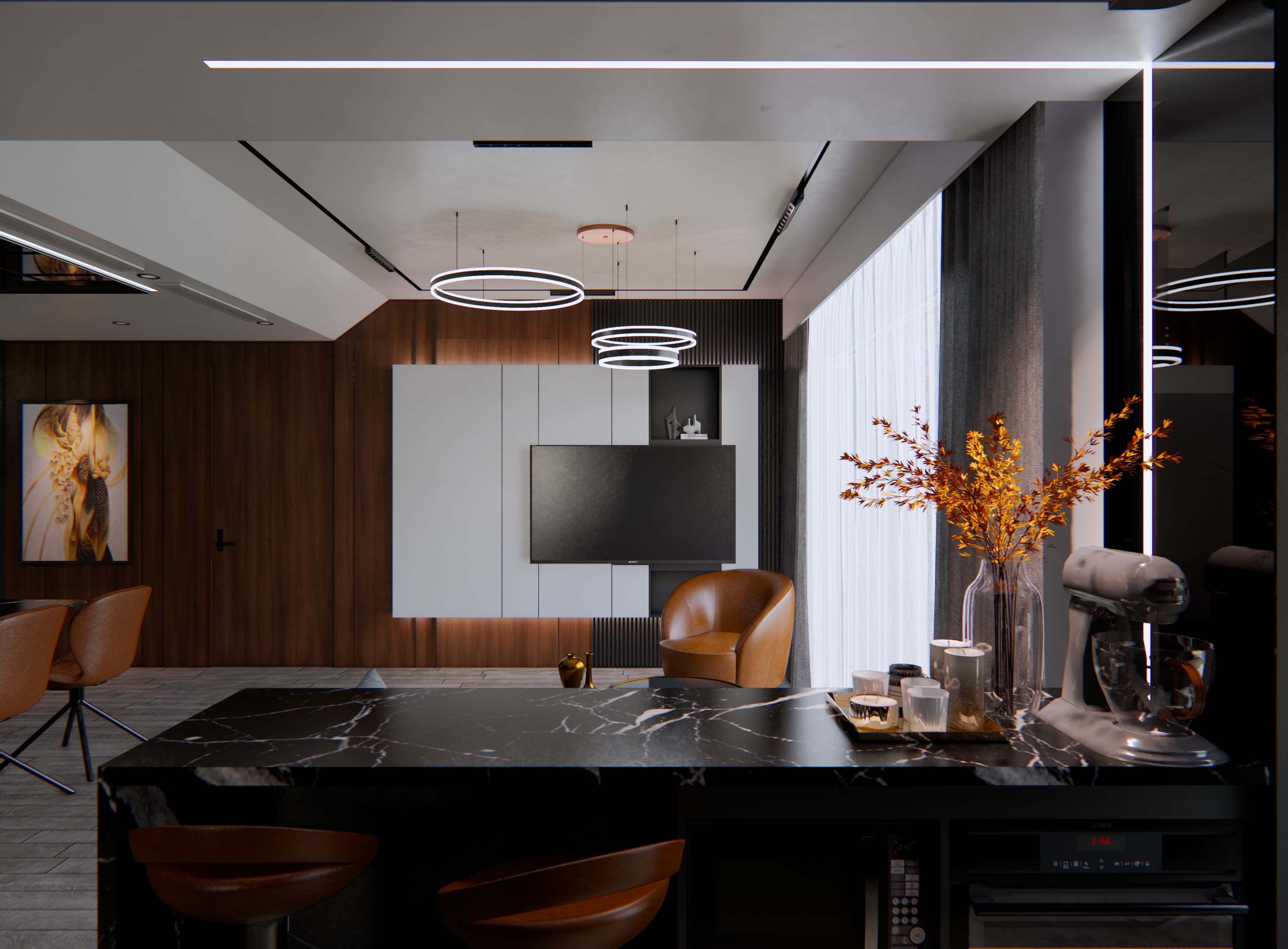 Nội thất sang trọng nổi bật trong không gian mở của bếp và phòng khách.