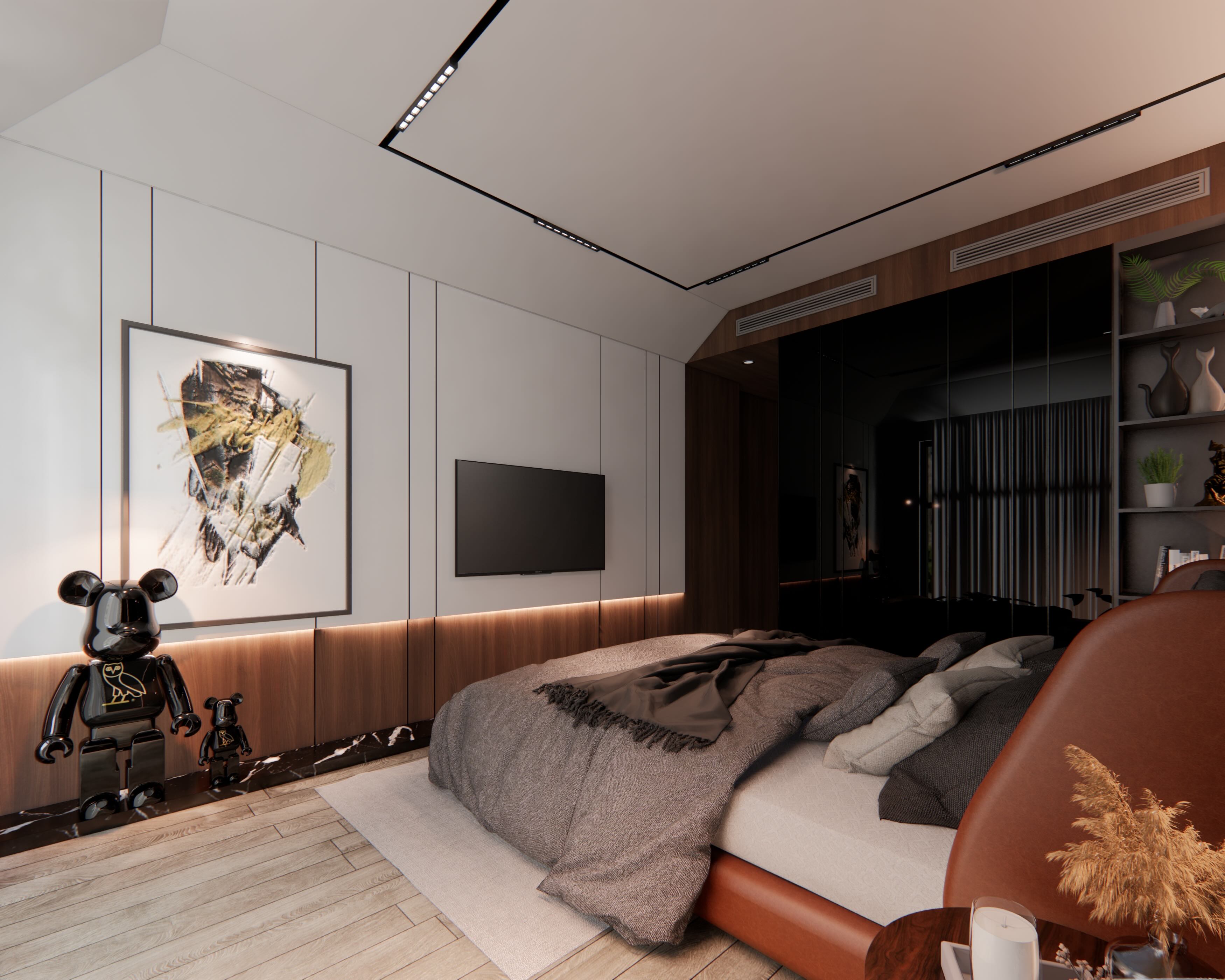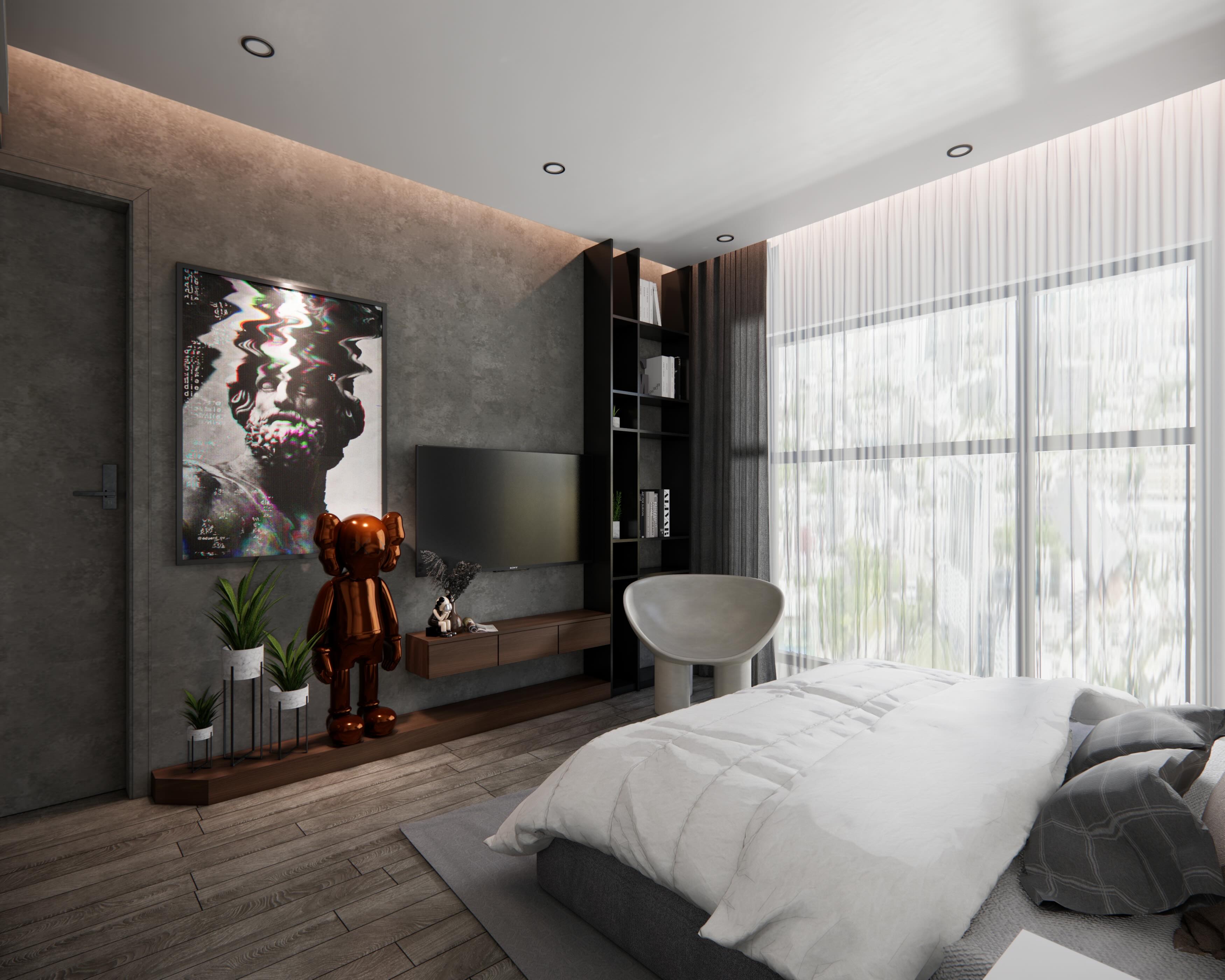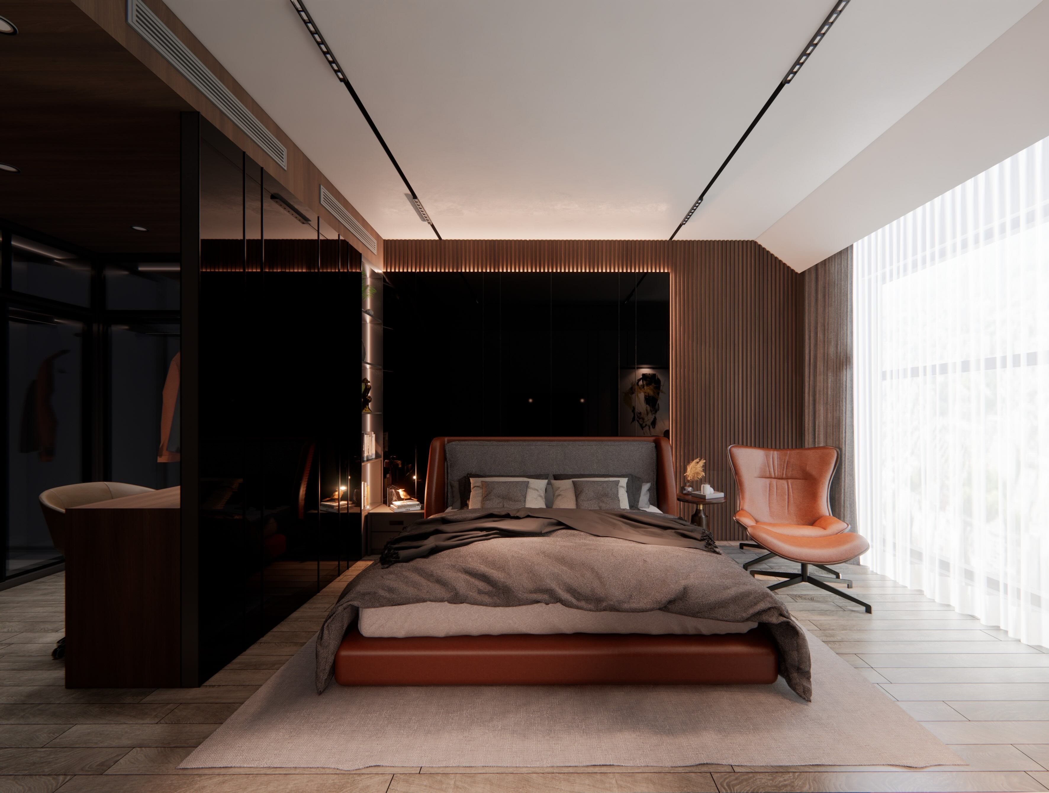Giường ngủ và các chất liệu gỗ màu nâu trầm tạo điểm nhấn cho căn phòng