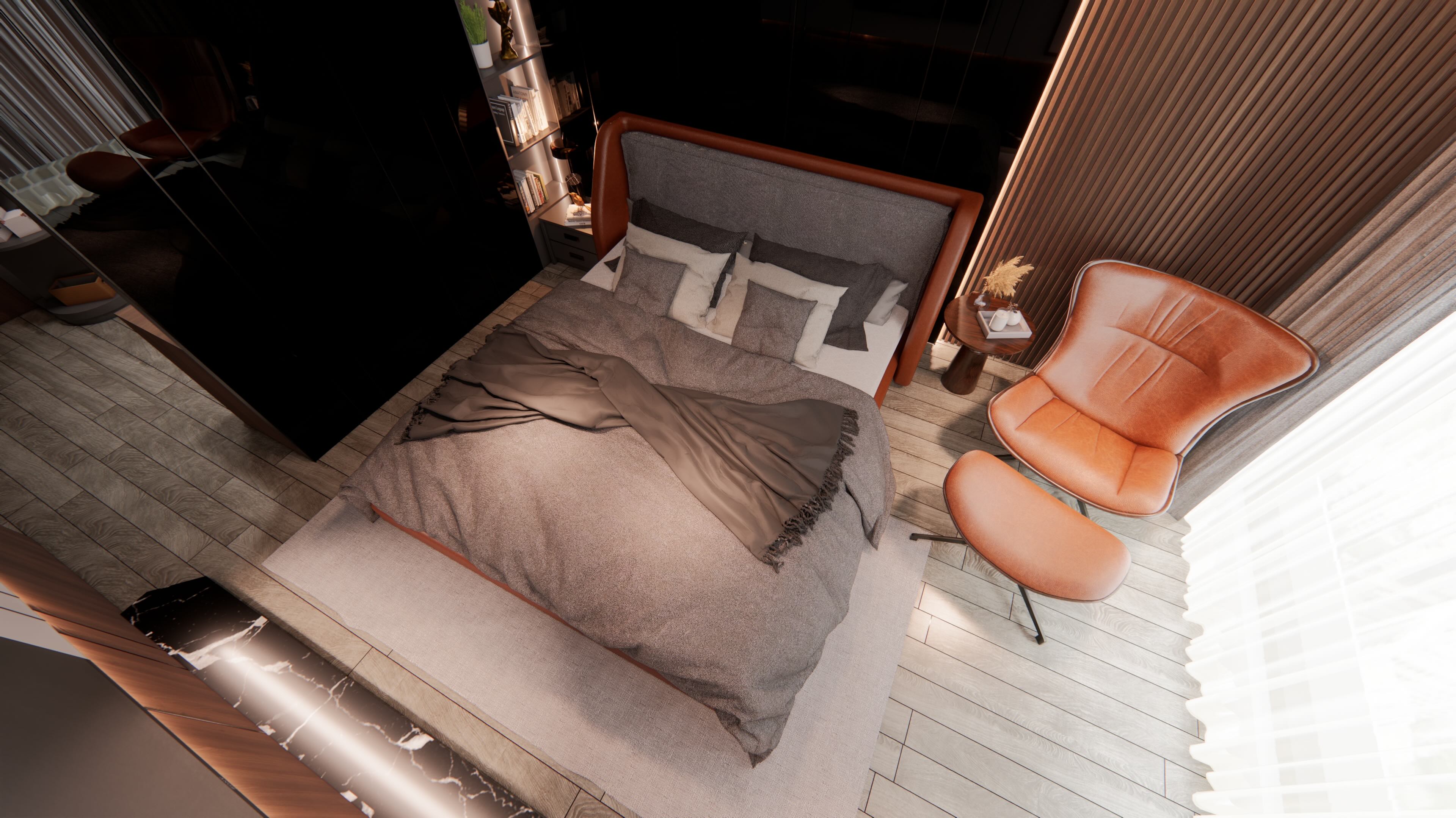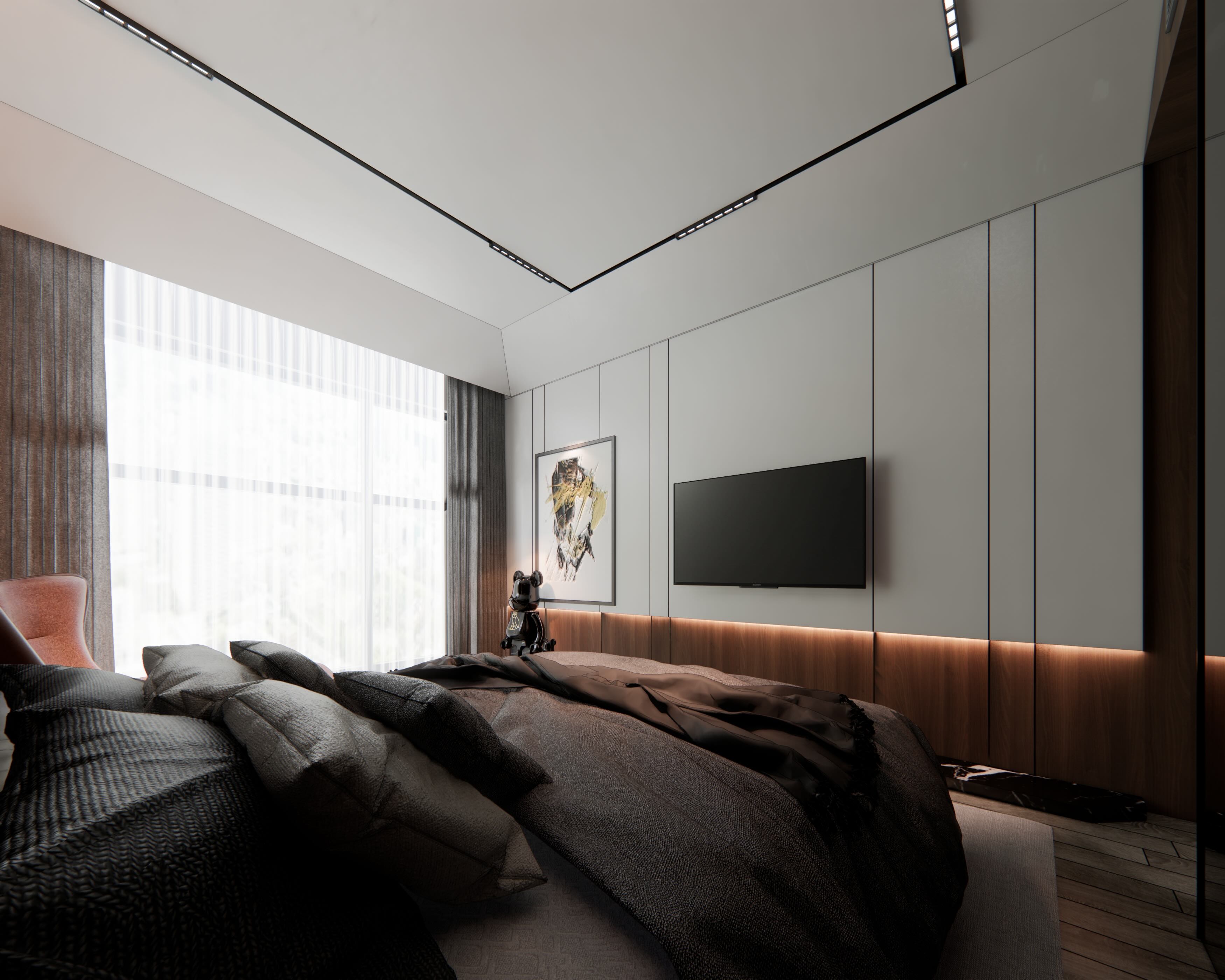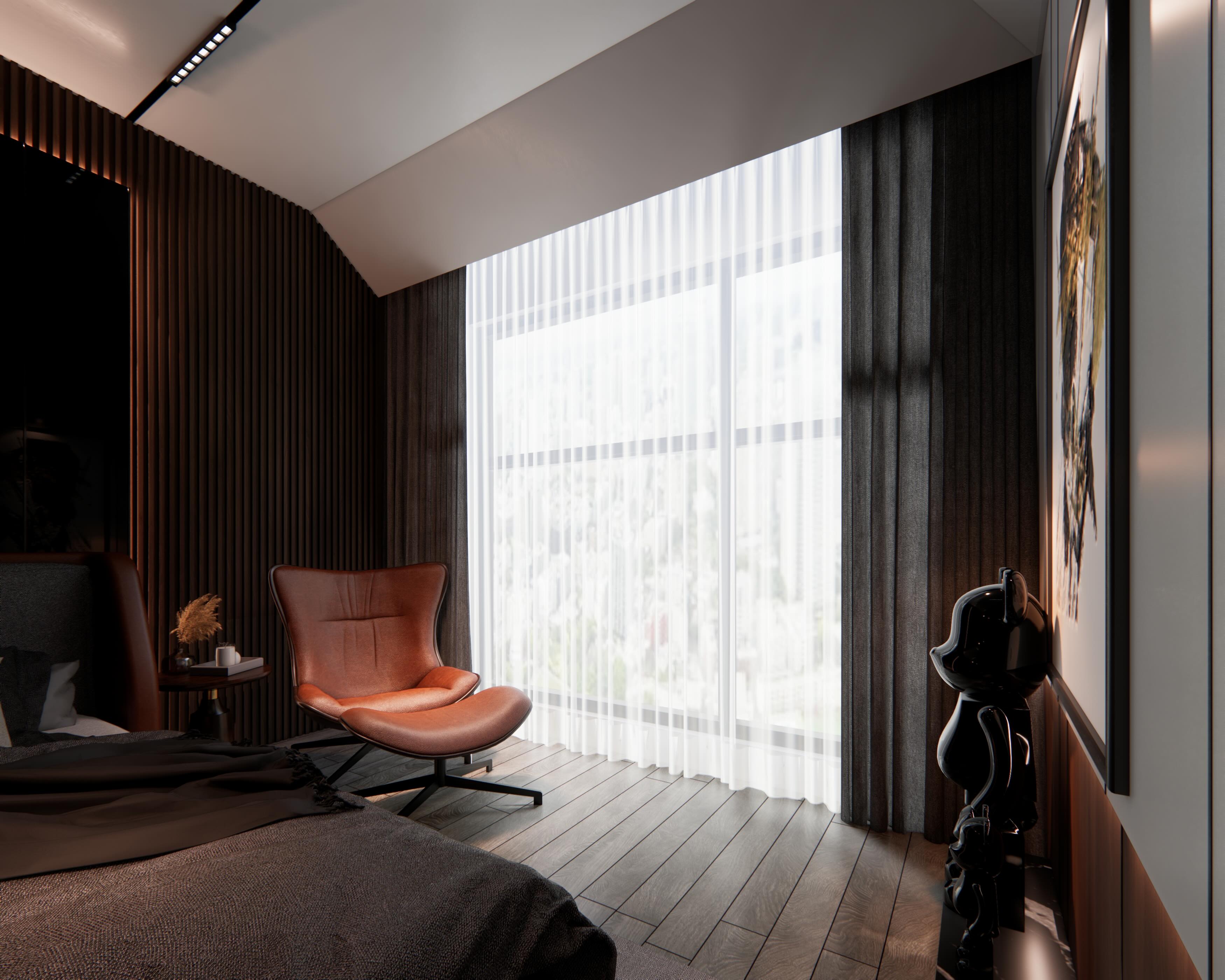 Giường ngủ và các chất liệu gỗ màu nâu trầm tạo điểm nhấn cho căn phòng