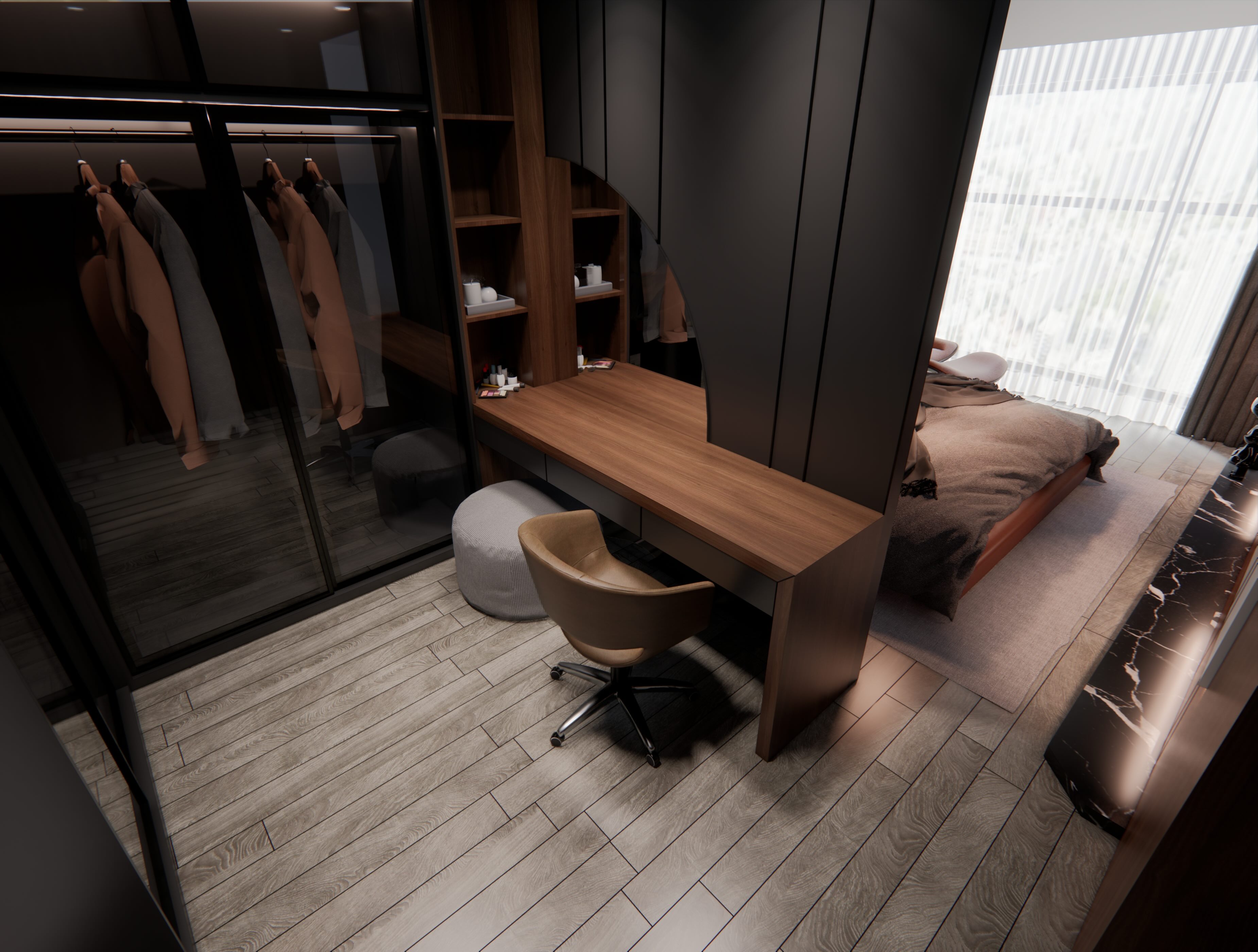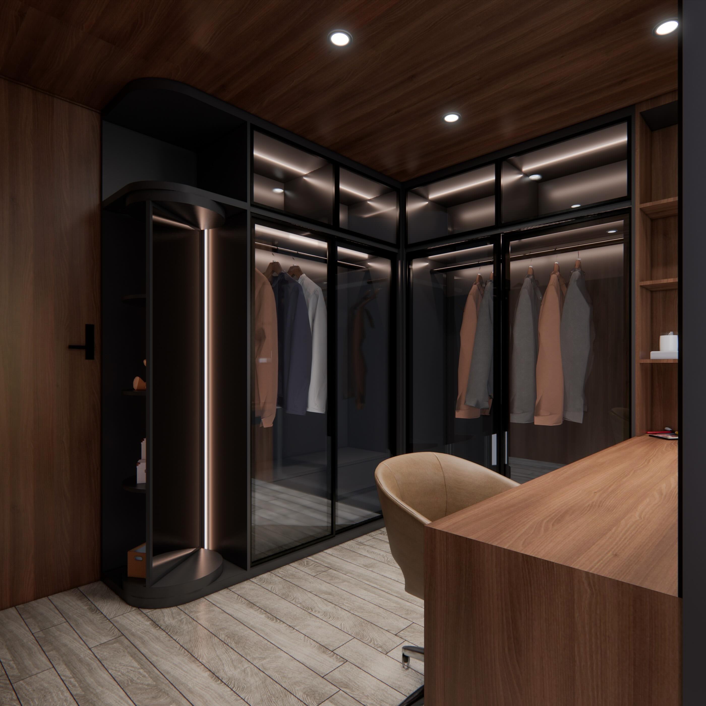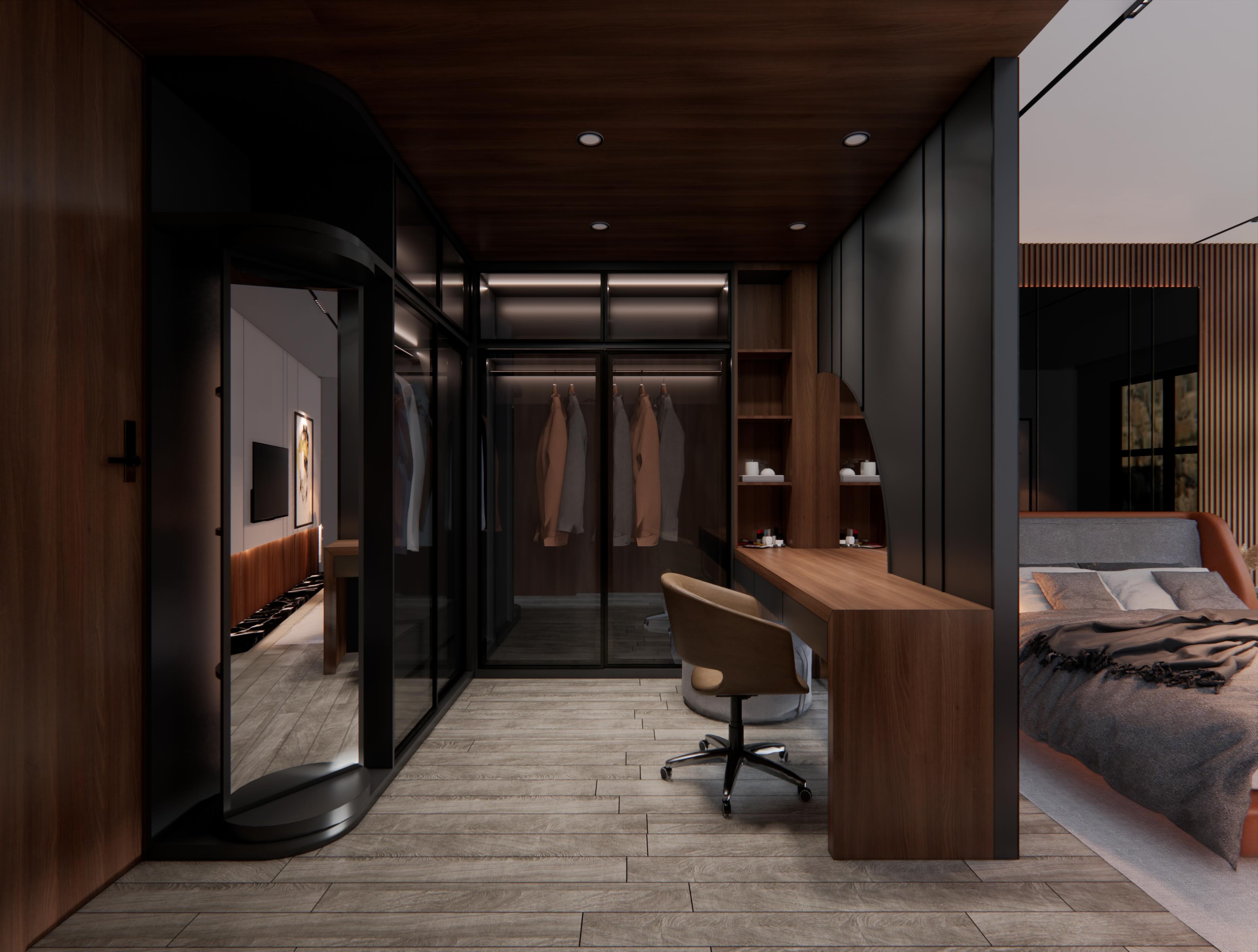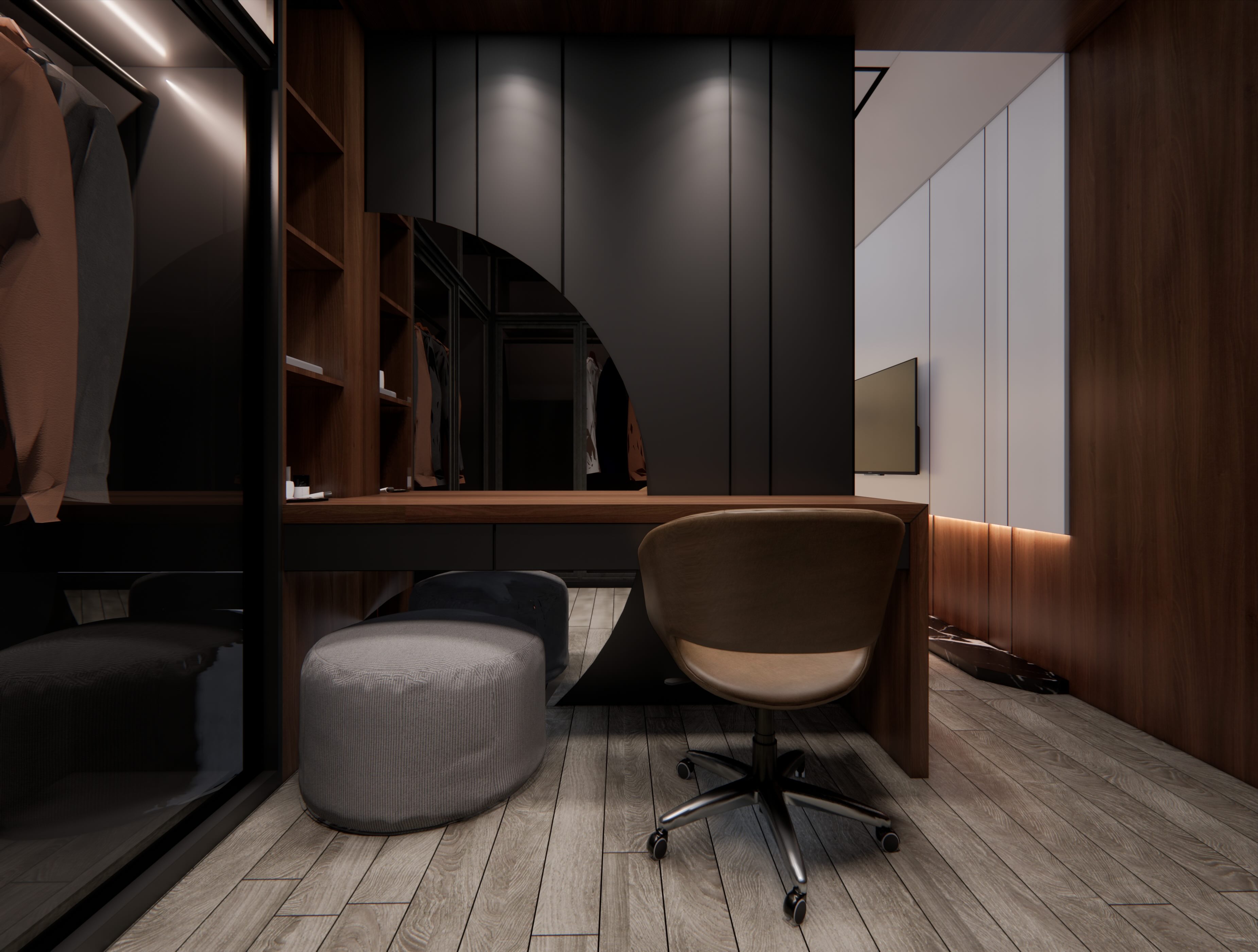 Tủ quần áo âm tường - không thể thiếu trong các công trình moder luxury - được chọn gỗ tone màu cam ấm, kết hợp cùng tổng thể căn nhà.