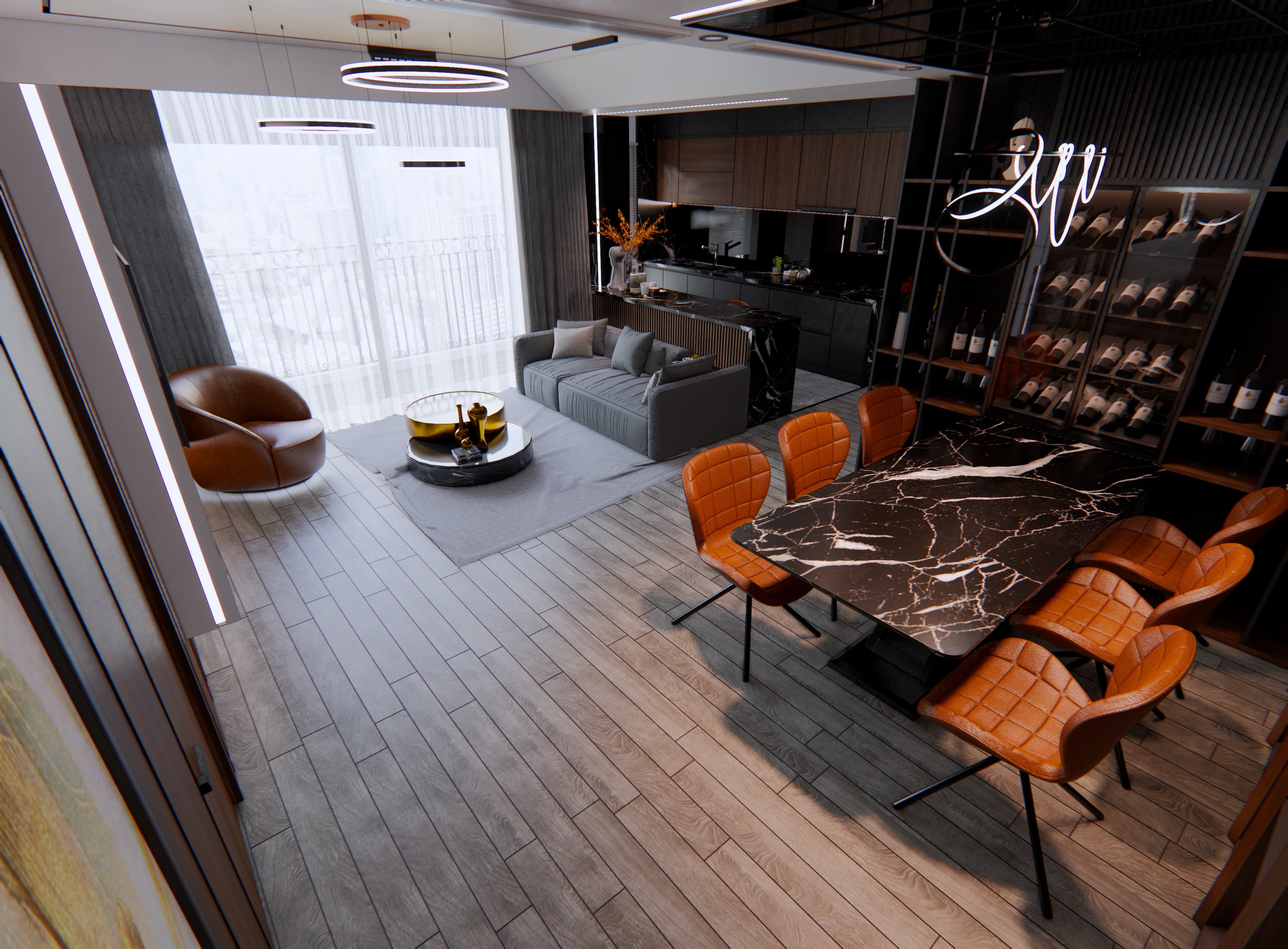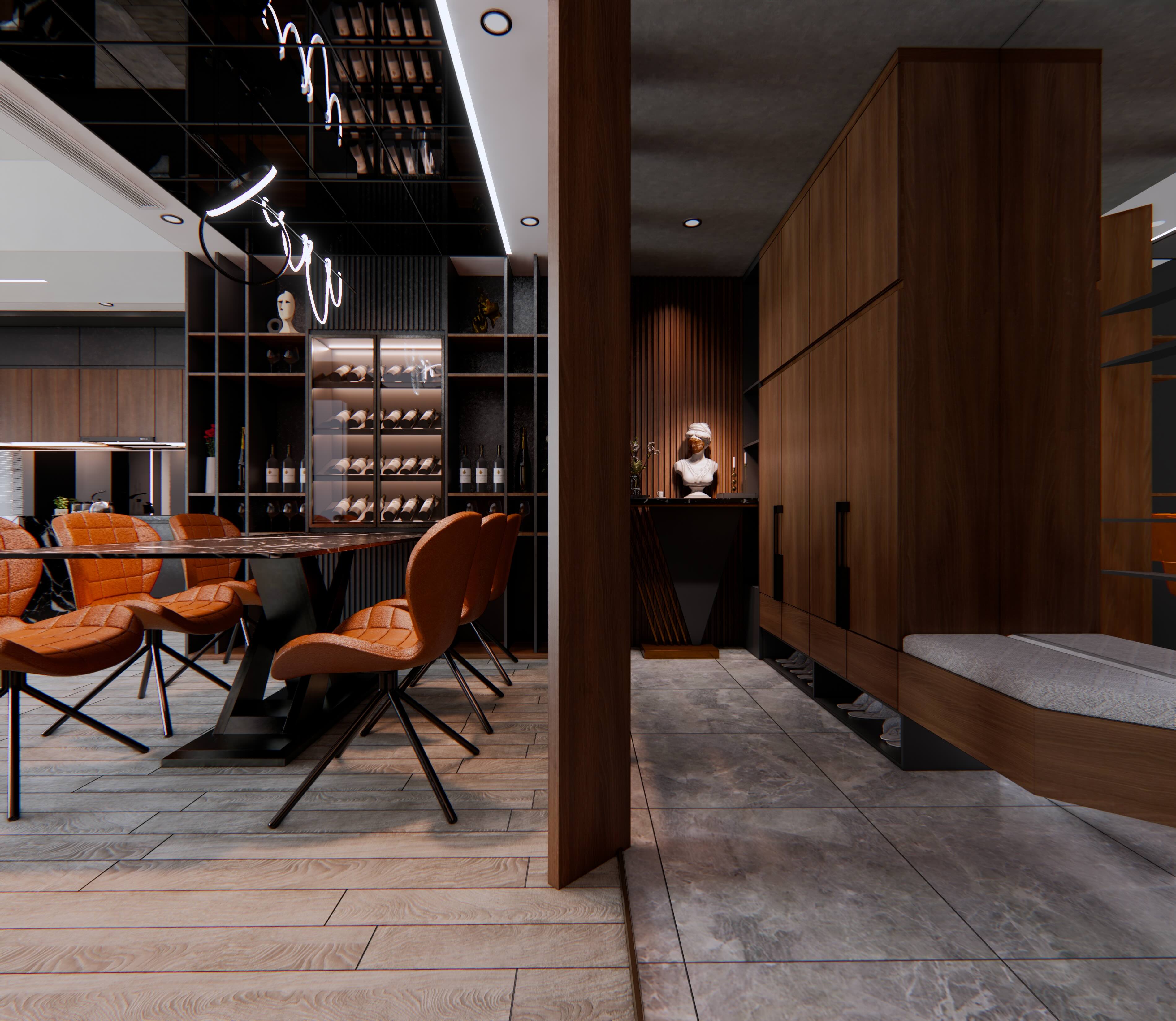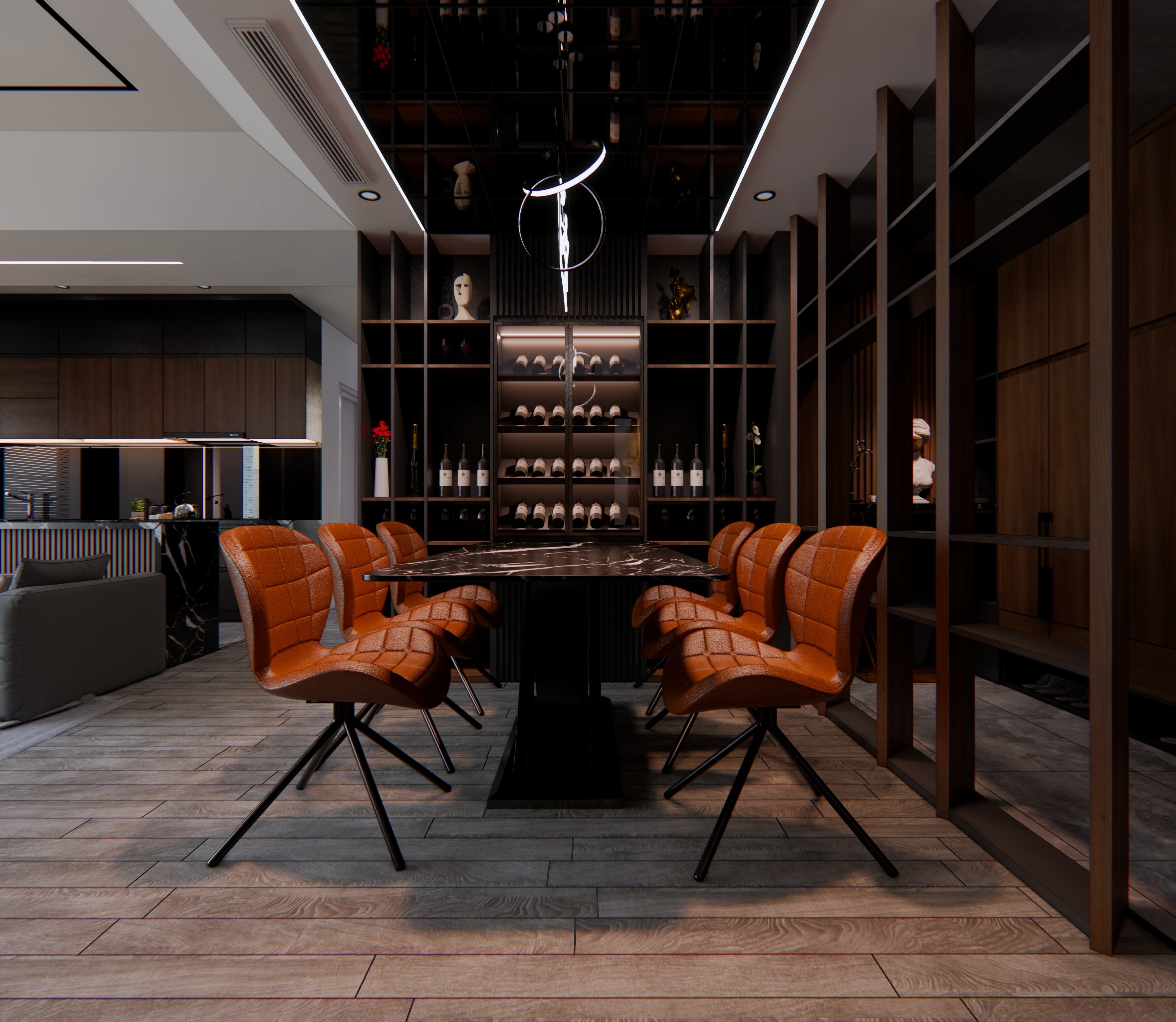 Khu vực bàn ăn nổi bật với ghế da cam và bàn đá đen vân trắng, phía sau là hệ thống tủ trưng bày rượu ấn tượng - sự phối hợp màu tương phản cực kì mạnh tay.